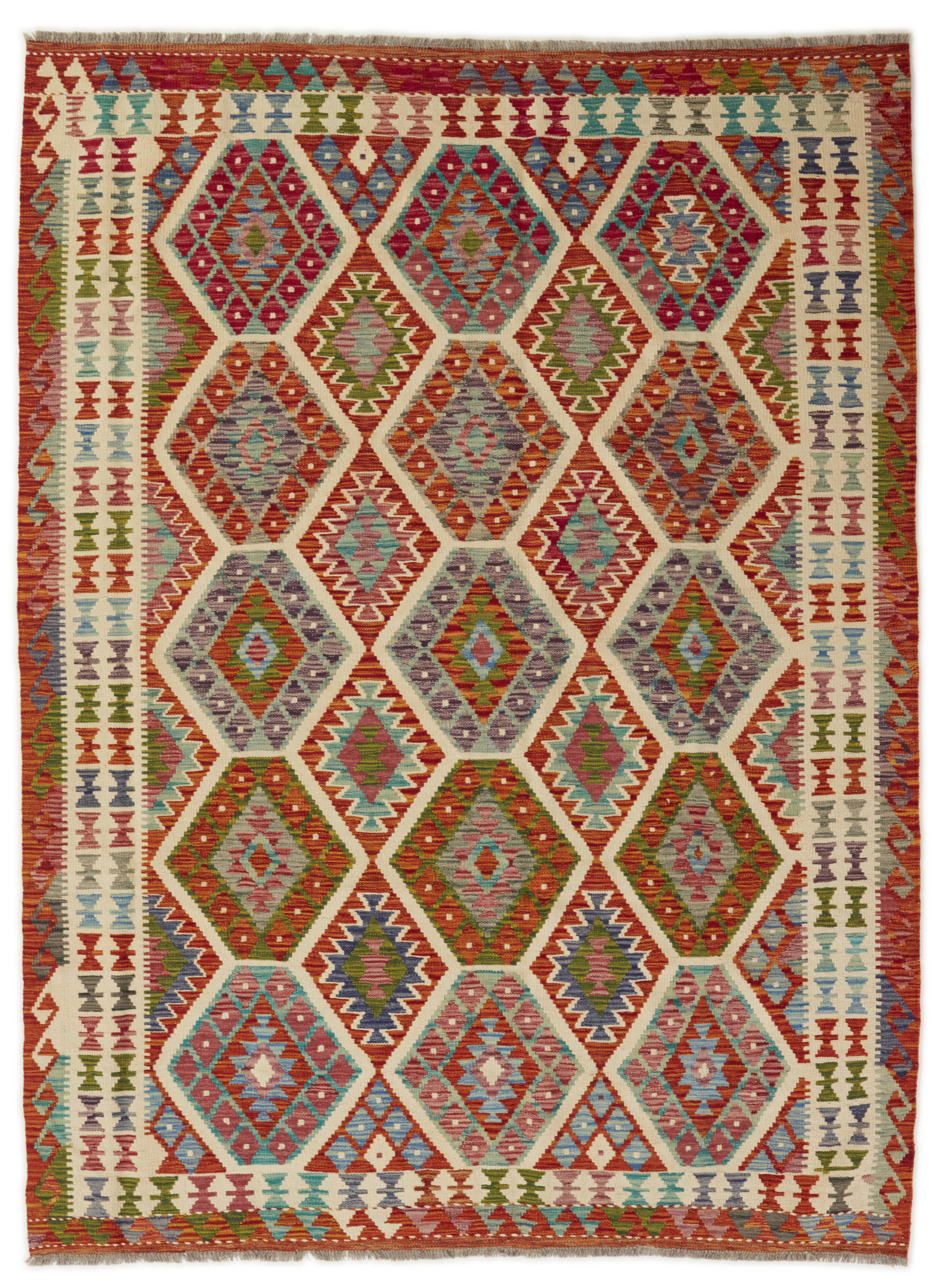 Afghan KelimItem no.: 1521663 Size: 180 cm x 241 cmAfghan Kelim rugs are hand woven by Turkmens in northern Afghanistan. Kelim is the name of a common Persian weave, but also of the technology used in the production. Kelims are primarily produced by nomads and are pile-less rugs, which are also used for bags, as wall decoration, or as curtains for tents. A natural colour scale with geometrical symbols and octagons is used.