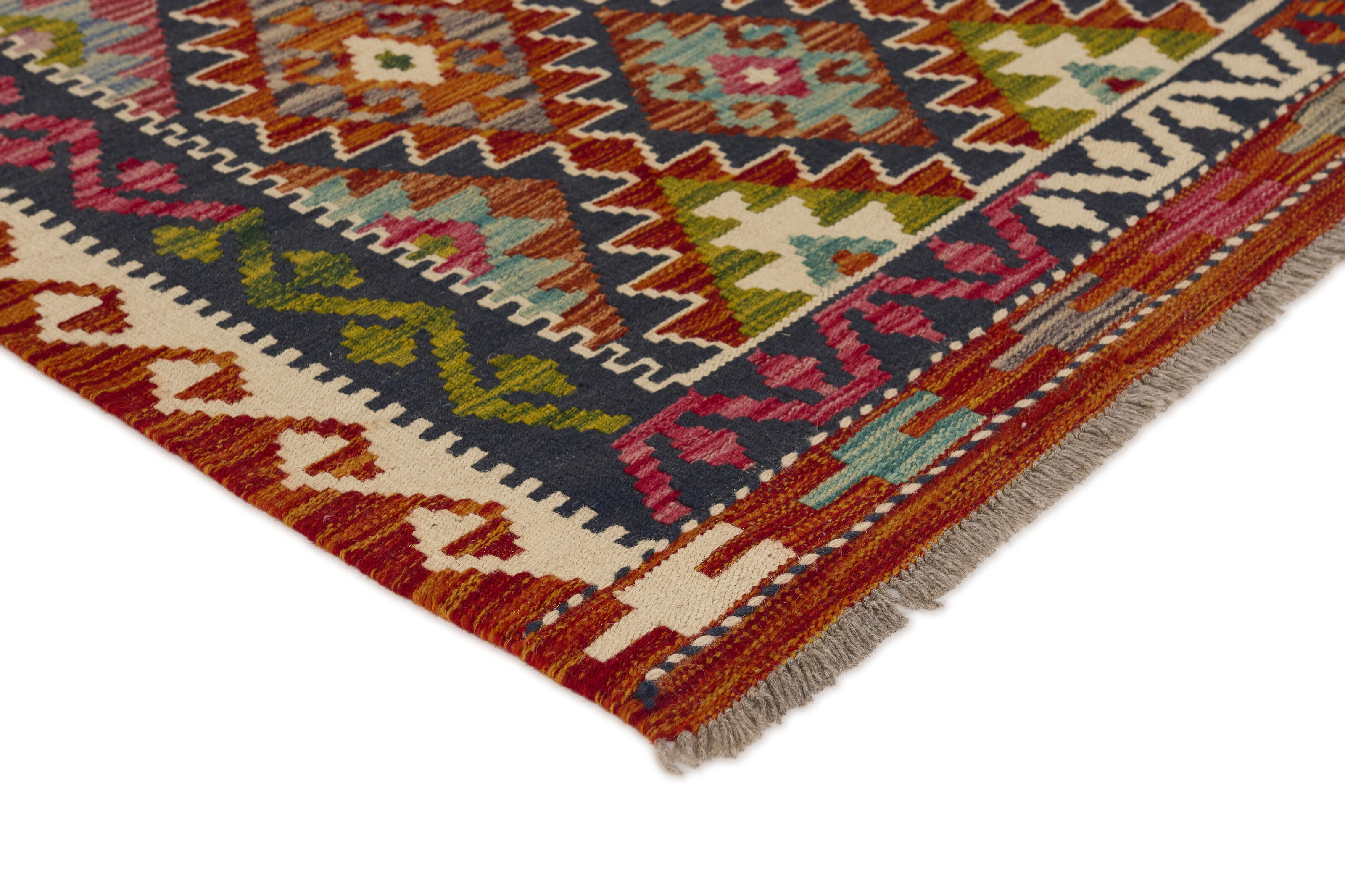 Afghan KelimItem no.: 1521668 Size: 183 cm x 243 cmAfghan Kelim rugs are hand woven by Turkmens in northern Afghanistan. Kelim is the name of a common Persian weave, but also of the technology used in the production. Kelims are primarily produced by nomads and are pile-less rugs, which are also used for bags, as wall decoration, or as curtains for tents. A natural colour scale with geometrical symbols and octagons is used.