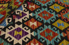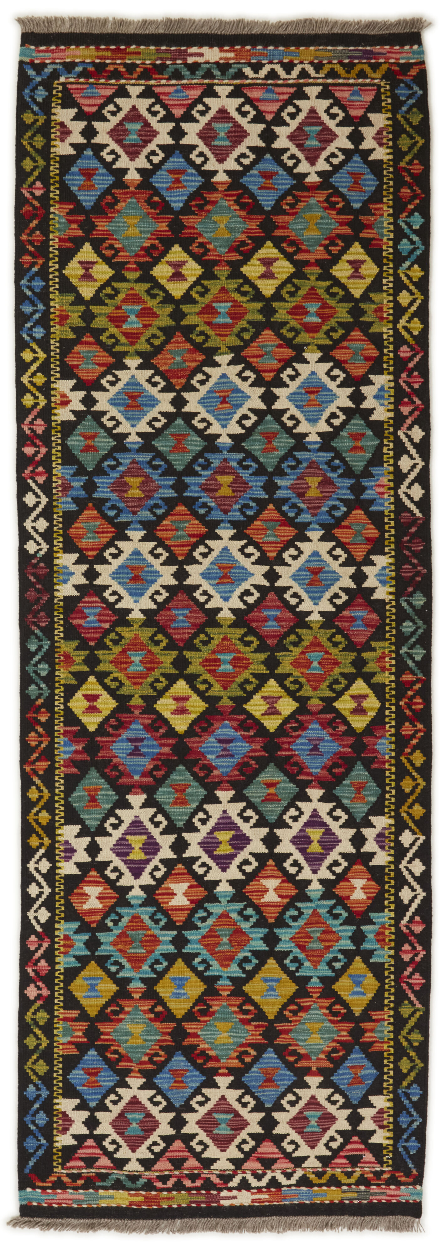 Afghan KelimItem no.: 1521672 Size: 85 cm x 244 cmAfghan Kelim rugs are hand woven by Turkmens in northern Afghanistan. Kelim is the name of a common Persian weave, but also of the technology used in the production. Kelims are primarily produced by nomads and are pile-less rugs, which are also used for bags, as wall decoration, or as curtains for tents. A natural colour scale with geometrical symbols and octagons is used.