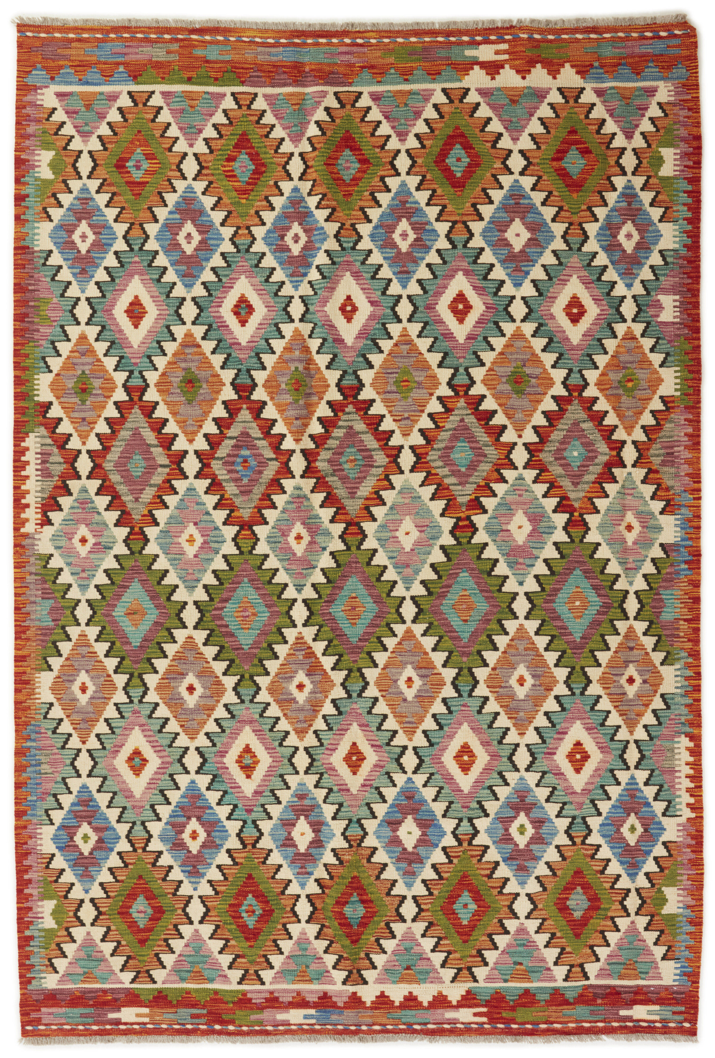 Afghan KelimItem no.: 1521678 Size: 170 cm x 247 cmAfghan Kelim rugs are hand woven by Turkmens in northern Afghanistan. Kelim is the name of a common Persian weave, but also of the technology used in the production. Kelims are primarily produced by nomads and are pile-less rugs, which are also used for bags, as wall decoration, or as curtains for tents. A natural colour scale with geometrical symbols and octagons is used.