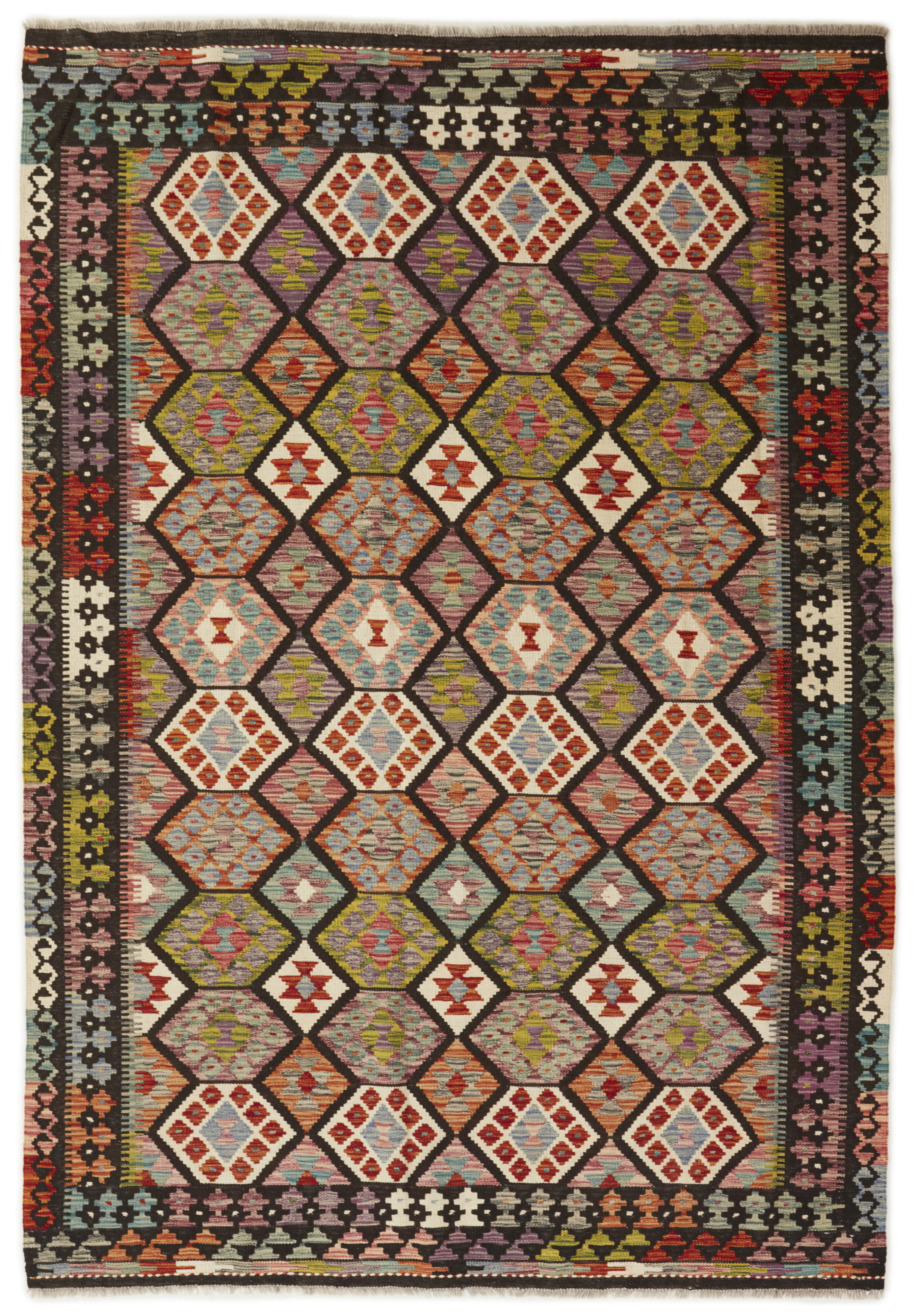 Afghan KelimItem no.: 1521685 Size: 174 cm x 250 cmAfghan Kelim rugs are hand woven by Turkmens in northern Afghanistan. Kelim is the name of a common Persian weave, but also of the technology used in the production. Kelims are primarily produced by nomads and are pile-less rugs, which are also used for bags, as wall decoration, or as curtains for tents. A natural colour scale with geometrical symbols and octagons is used.