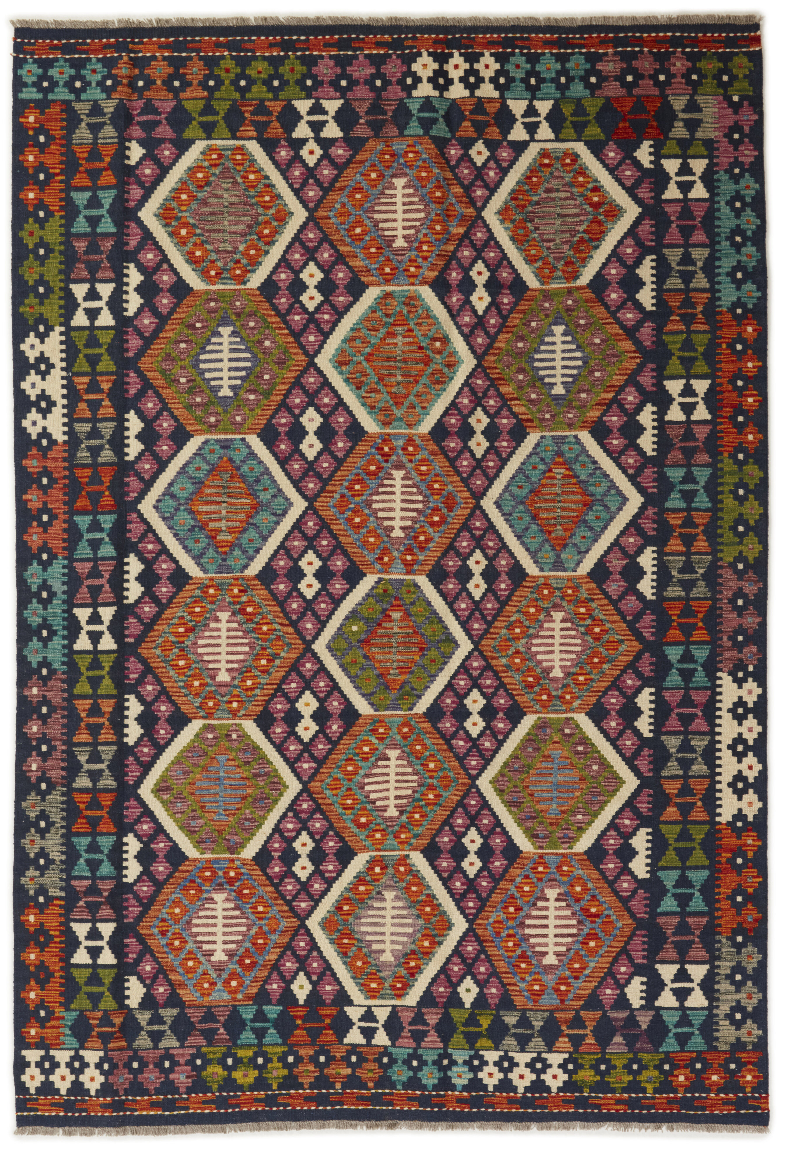 Afghan KelimItem no.: 1521696 Size: 173 cm x 253 cmAfghan Kelim rugs are hand woven by Turkmens in northern Afghanistan. Kelim is the name of a common Persian weave, but also of the technology used in the production. Kelims are primarily produced by nomads and are pile-less rugs, which are also used for bags, as wall decoration, or as curtains for tents. A natural colour scale with geometrical symbols and octagons is used.