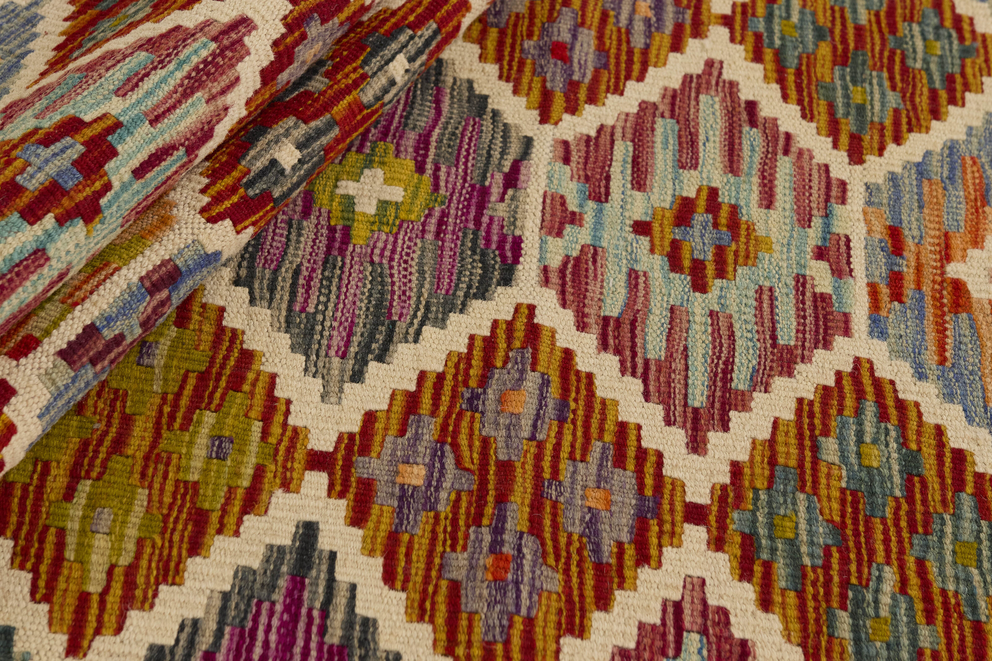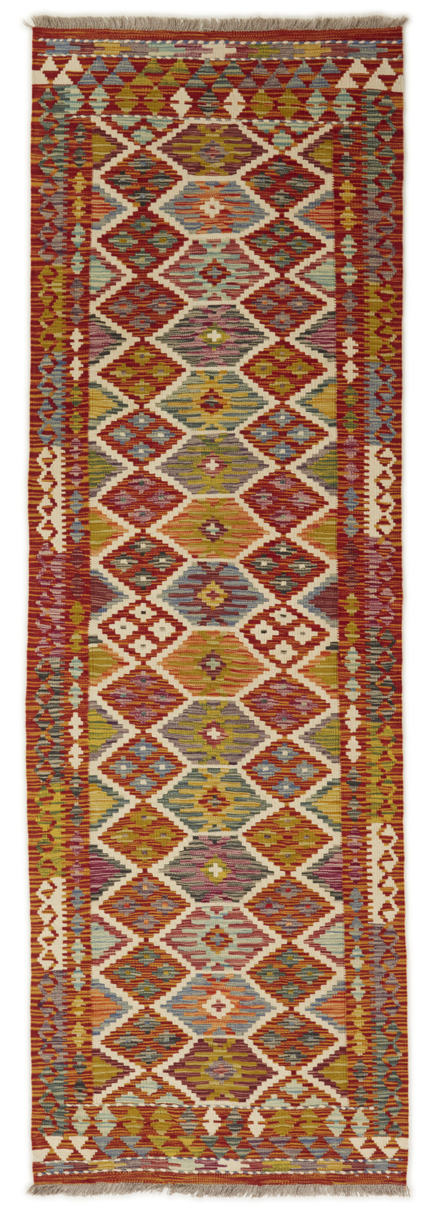 Afghan KelimItem no.: 1521698 Size: 83 cm x 258 cmAfghan Kelim rugs are hand woven by Turkmens in northern Afghanistan. Kelim is the name of a common Persian weave, but also of the technology used in the production. Kelims are primarily produced by nomads and are pile-less rugs, which are also used for bags, as wall decoration, or as curtains for tents. A natural colour scale with geometrical symbols and octagons is used.
