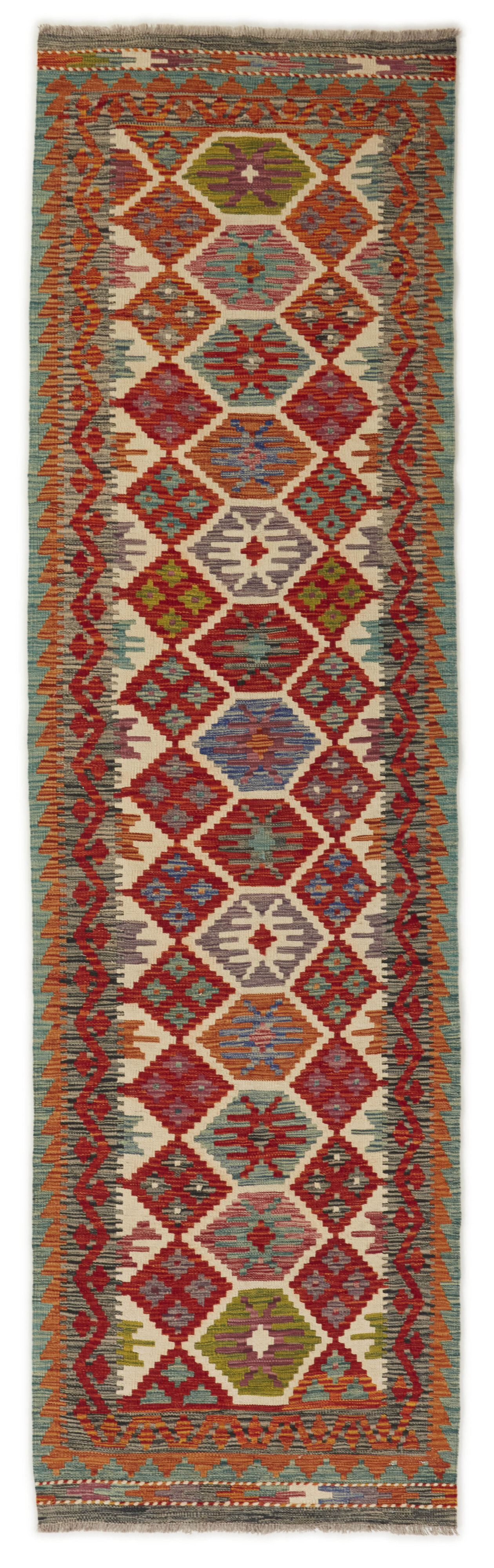 Afghan KelimItem no.: 1521702 Size: 81 cm x 288 cmAfghan Kelim rugs are hand woven by Turkmens in northern Afghanistan. Kelim is the name of a common Persian weave, but also of the technology used in the production. Kelims are primarily produced by nomads and are pile-less rugs, which are also used for bags, as wall decoration, or as curtains for tents. A natural colour scale with geometrical symbols and octagons is used.