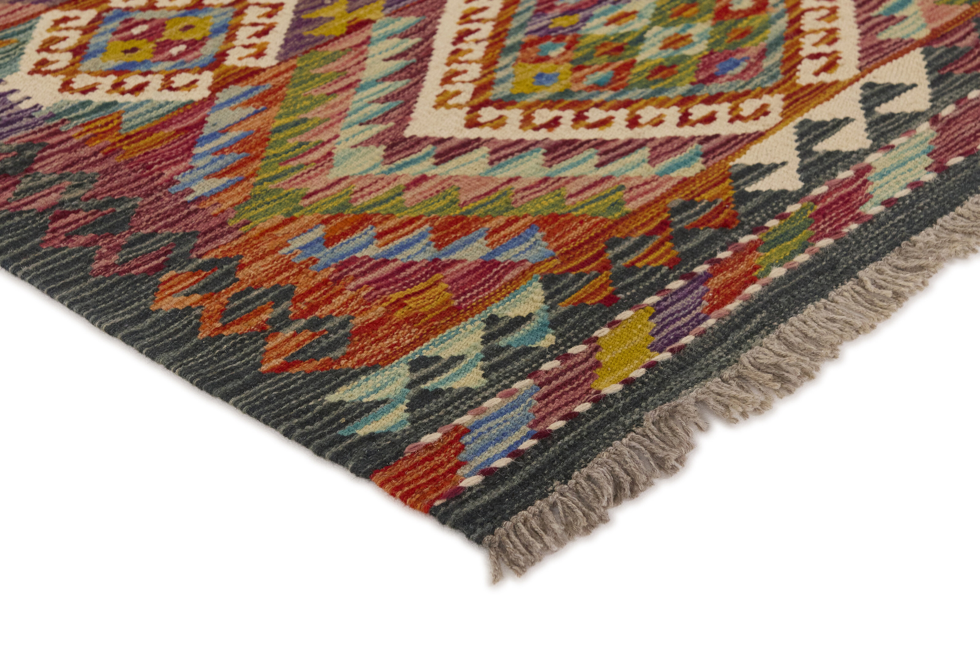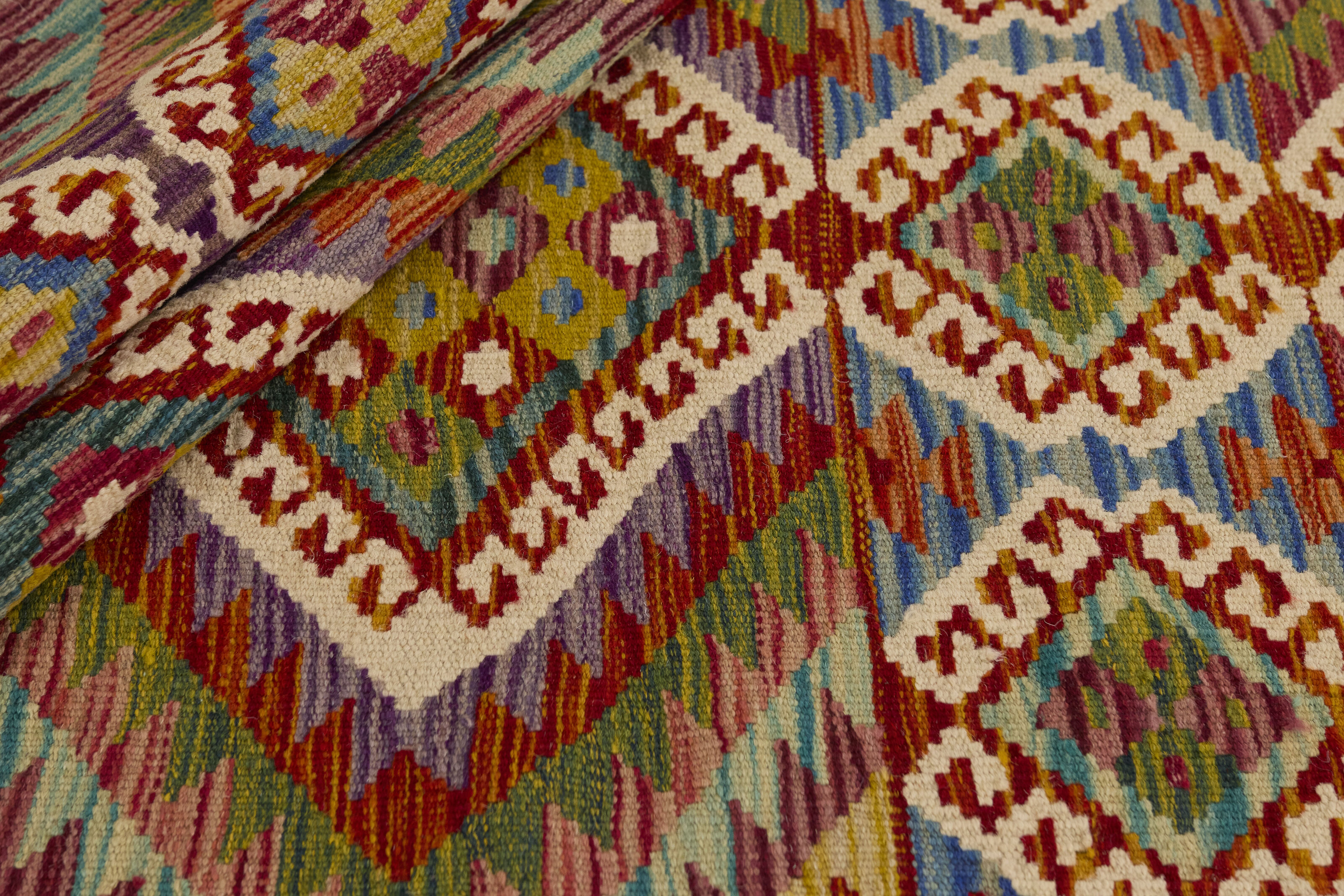 Afghan KelimItem no.: 1521717 Size: 82 cm x 298 cmAfghan Kelim rugs are hand woven by Turkmens in northern Afghanistan. Kelim is the name of a common Persian weave, but also of the technology used in the production. Kelims are primarily produced by nomads and are pile-less rugs, which are also used for bags, as wall decoration, or as curtains for tents. A natural colour scale with geometrical symbols and octagons is used.