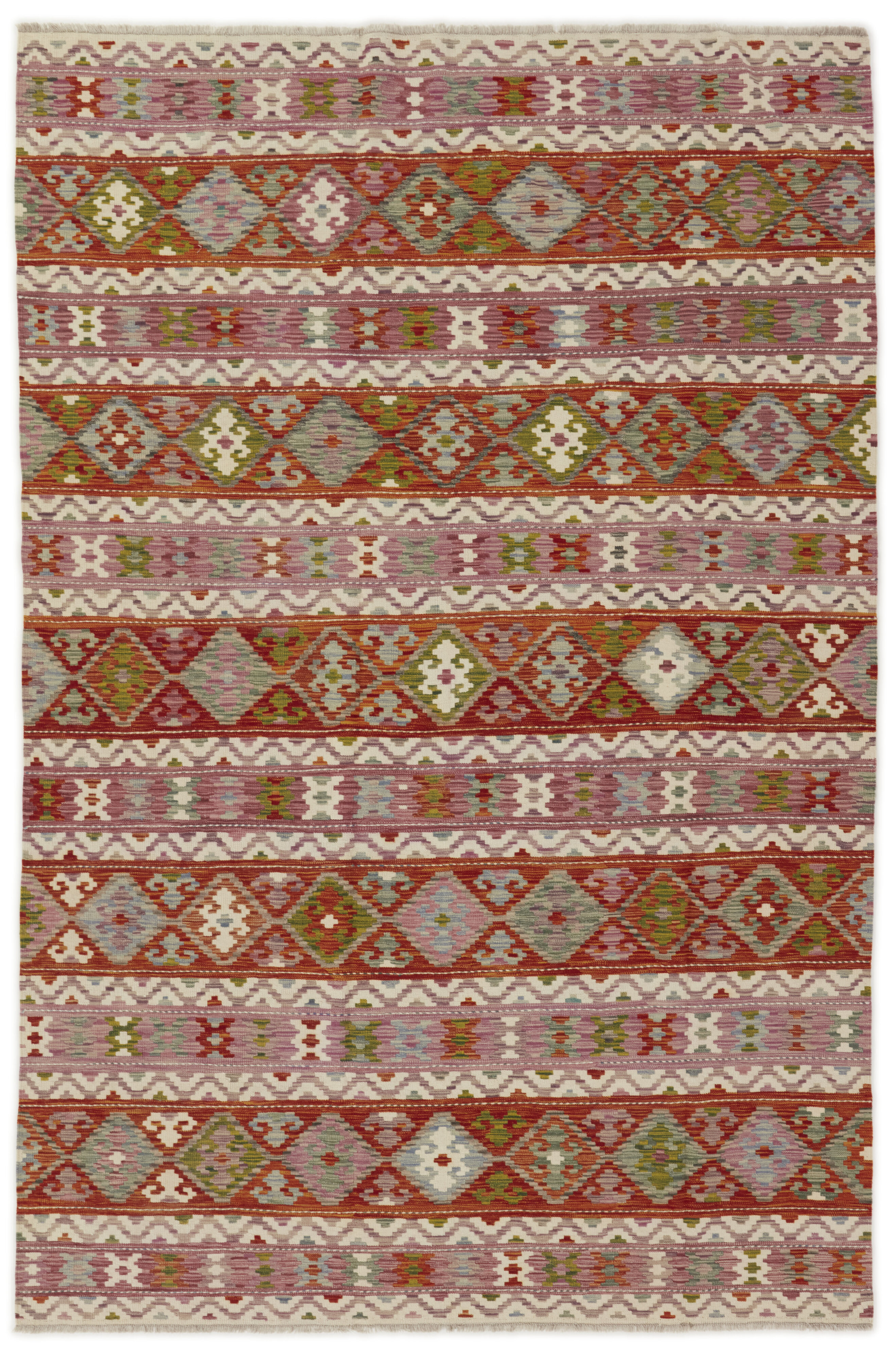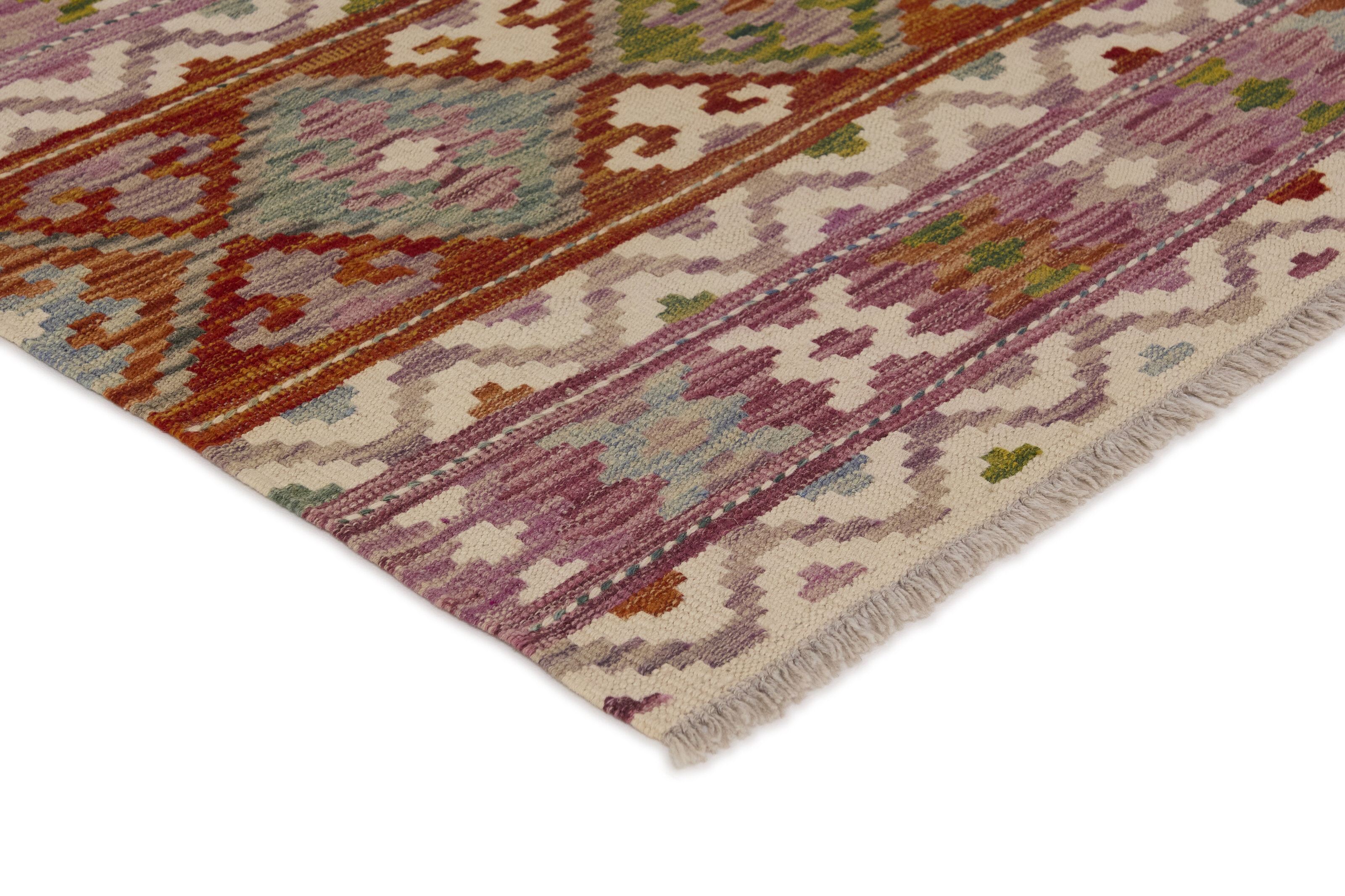 Afghan KelimItem no.: 1521718 Size: 198 cm x 298 cmAfghan Kelim rugs are hand woven by Turkmens in northern Afghanistan. Kelim is the name of a common Persian weave, but also of the technology used in the production. Kelims are primarily produced by nomads and are pile-less rugs, which are also used for bags, as wall decoration, or as curtains for tents. A natural colour scale with geometrical symbols and octagons is used.