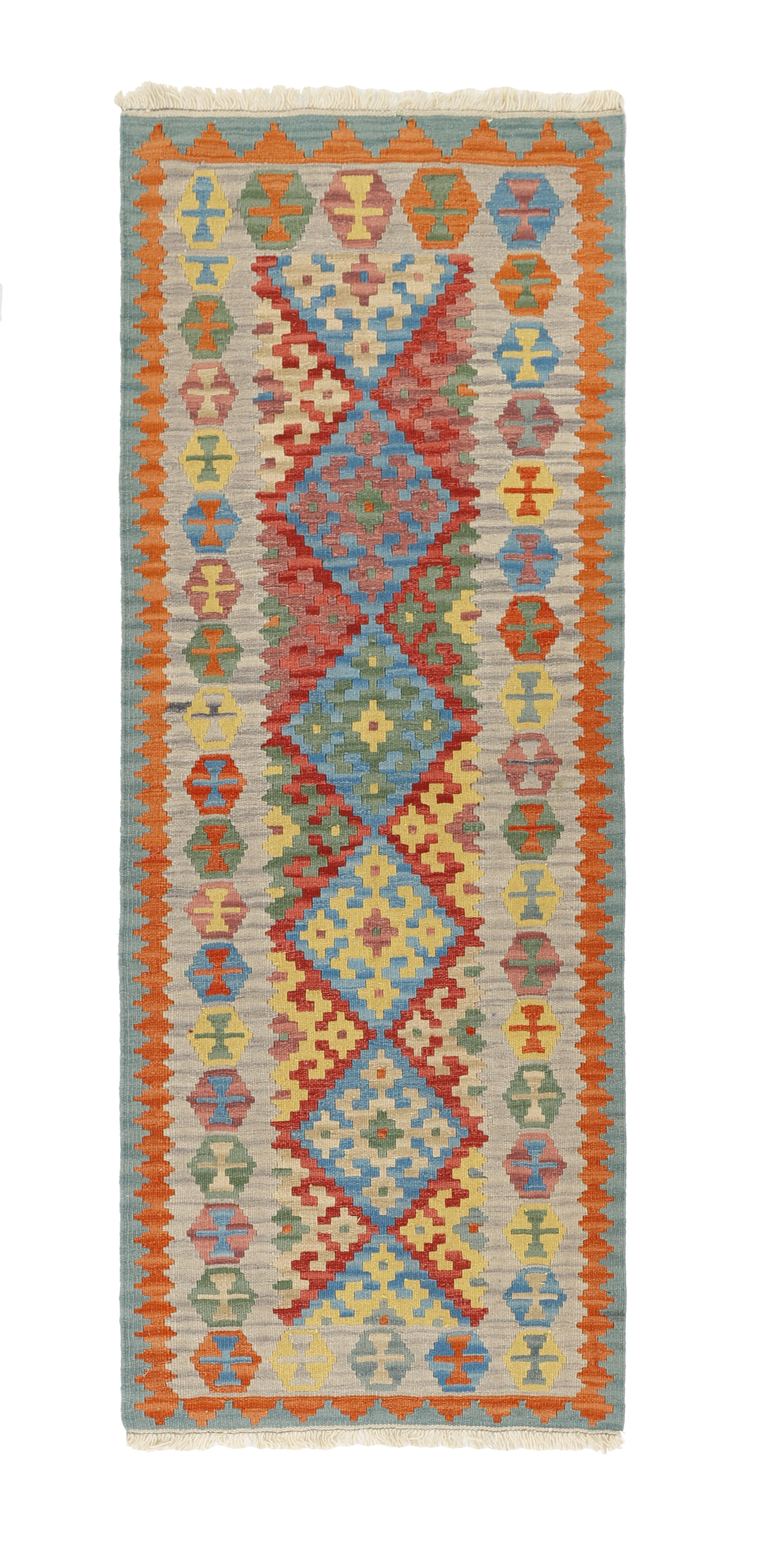 KelimItem no.: 1519213 Size: 83 cm x 233 cmThese Kelims are flat woven rugs, woven by nomads in western Persia. A special weaving technique is used, giving the rug a thinner, flatter surface, with no pile. Kelims are also quicker to produce, compared to common Oriental rugs. The colours are natural and no two rugs are alike. Kelims are produced in several regions and under many names, but the most well known Kelim types are Seneh, Sumak, Fars, and Kelim Gashghai.