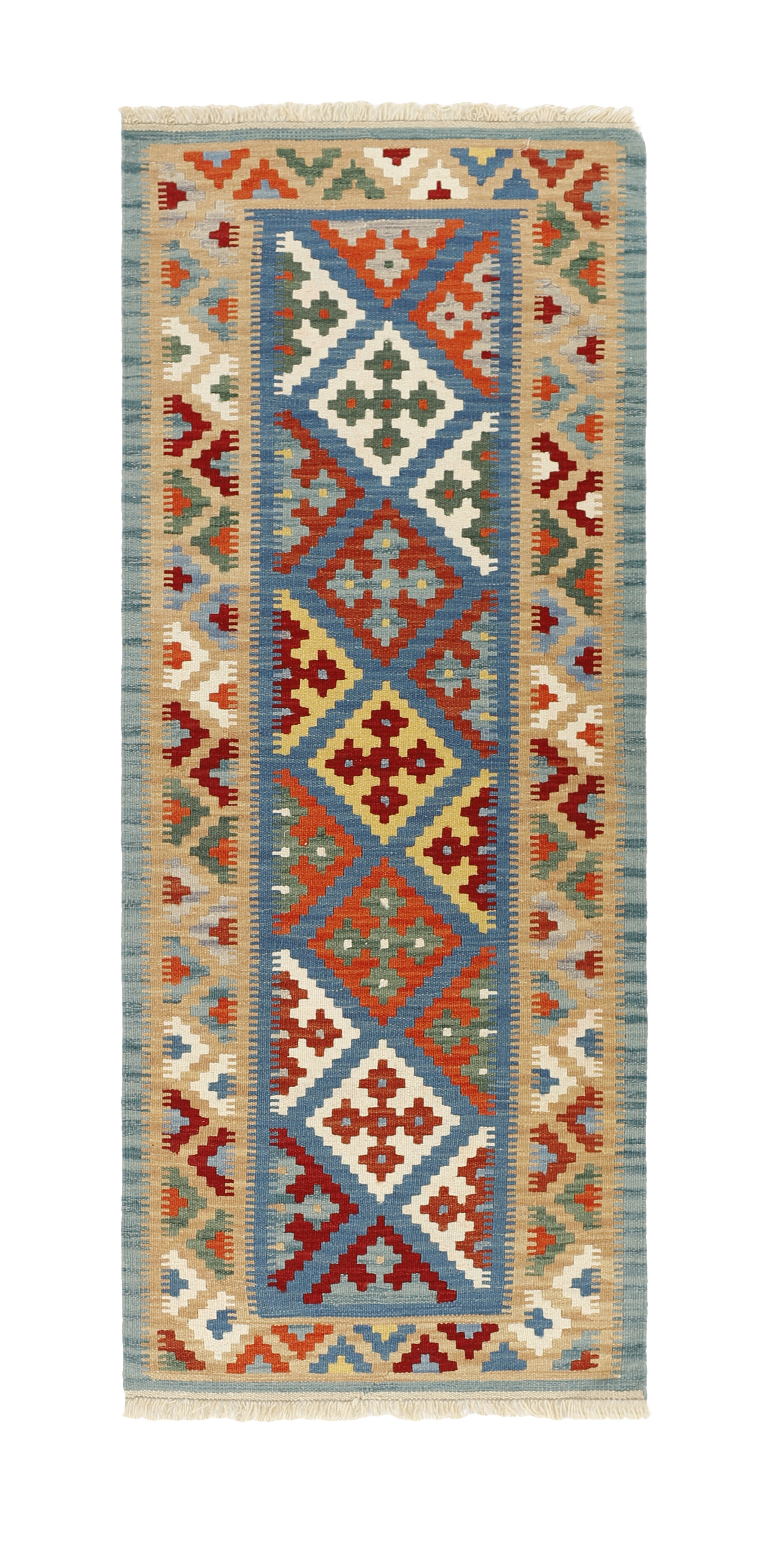 KelimItem no.: 1519222 Size: 81 cm x 205 cmThese Kelims are flat woven rugs, woven by nomads in western Persia. A special weaving technique is used, giving the rug a thinner, flatter surface, with no pile. Kelims are also quicker to produce, compared to common Oriental rugs. The colours are natural and no two rugs are alike. Kelims are produced in several regions and under many names, but the most well known Kelim types are Seneh, Sumak, Fars, and Kelim Gashghai.