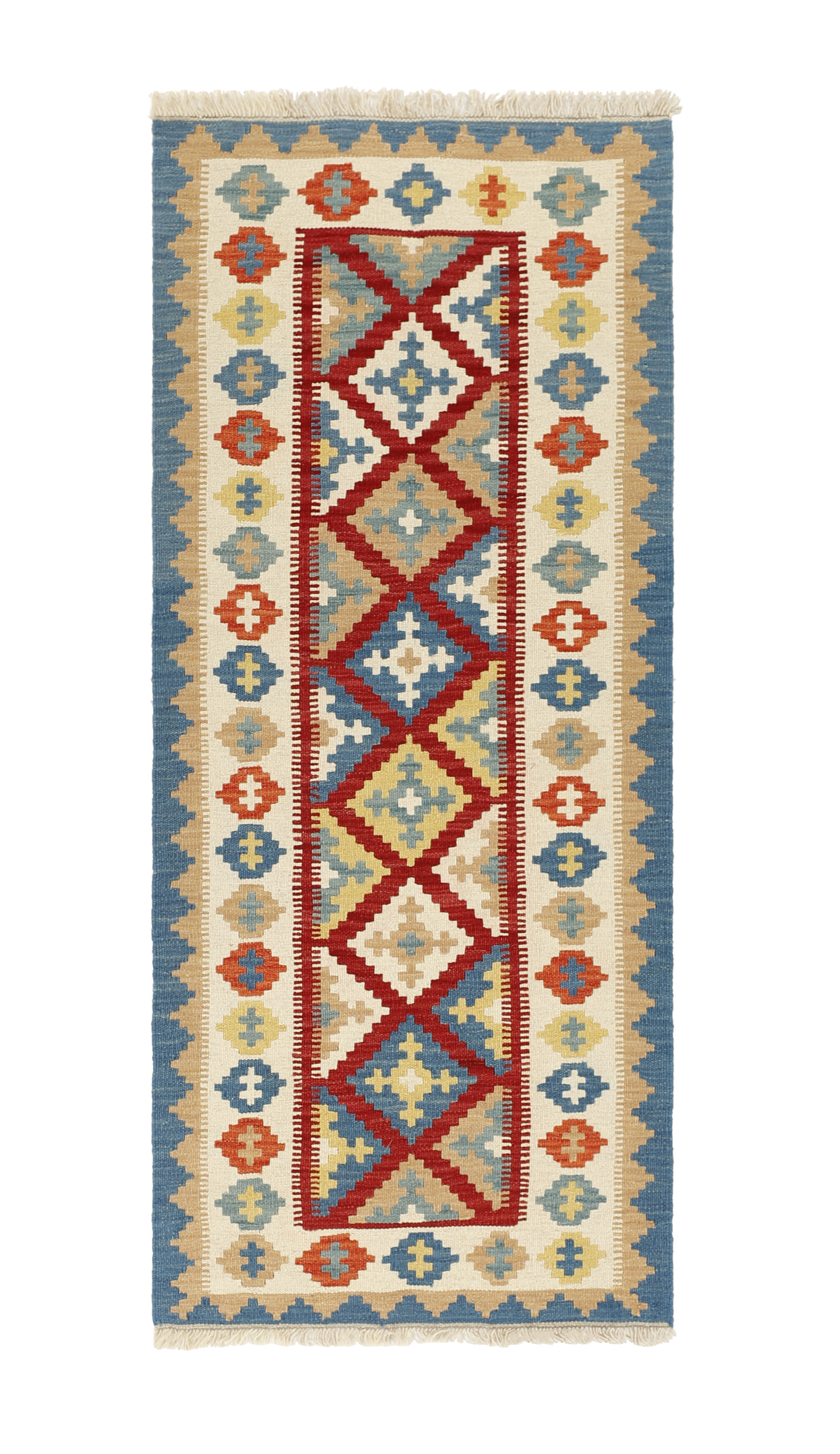 KelimItem no.: 1519231 Size: 83 cm x 193 cmThese Kelims are flat woven rugs, woven by nomads in western Persia. A special weaving technique is used, giving the rug a thinner, flatter surface, with no pile. Kelims are also quicker to produce, compared to common Oriental rugs. The colours are natural and no two rugs are alike. Kelims are produced in several regions and under many names, but the most well known Kelim types are Seneh, Sumak, Fars, and Kelim Gashghai.