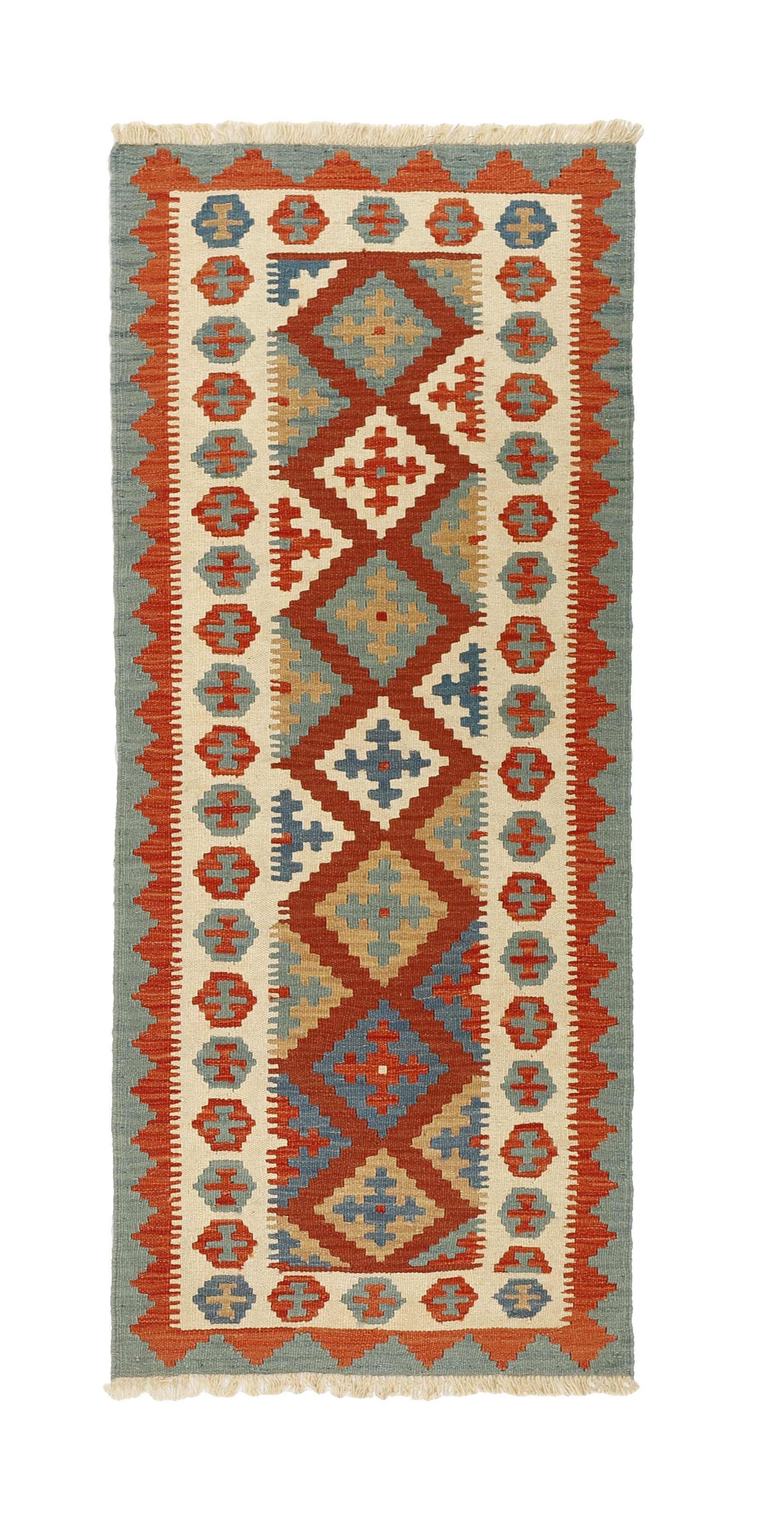 KelimItem no.: 1519232 Size: 79 cm x 195 cmThese Kelims are flat woven rugs, woven by nomads in western Persia. A special weaving technique is used, giving the rug a thinner, flatter surface, with no pile. Kelims are also quicker to produce, compared to common Oriental rugs. The colours are natural and no two rugs are alike. Kelims are produced in several regions and under many names, but the most well known Kelim types are Seneh, Sumak, Fars, and Kelim Gashghai.