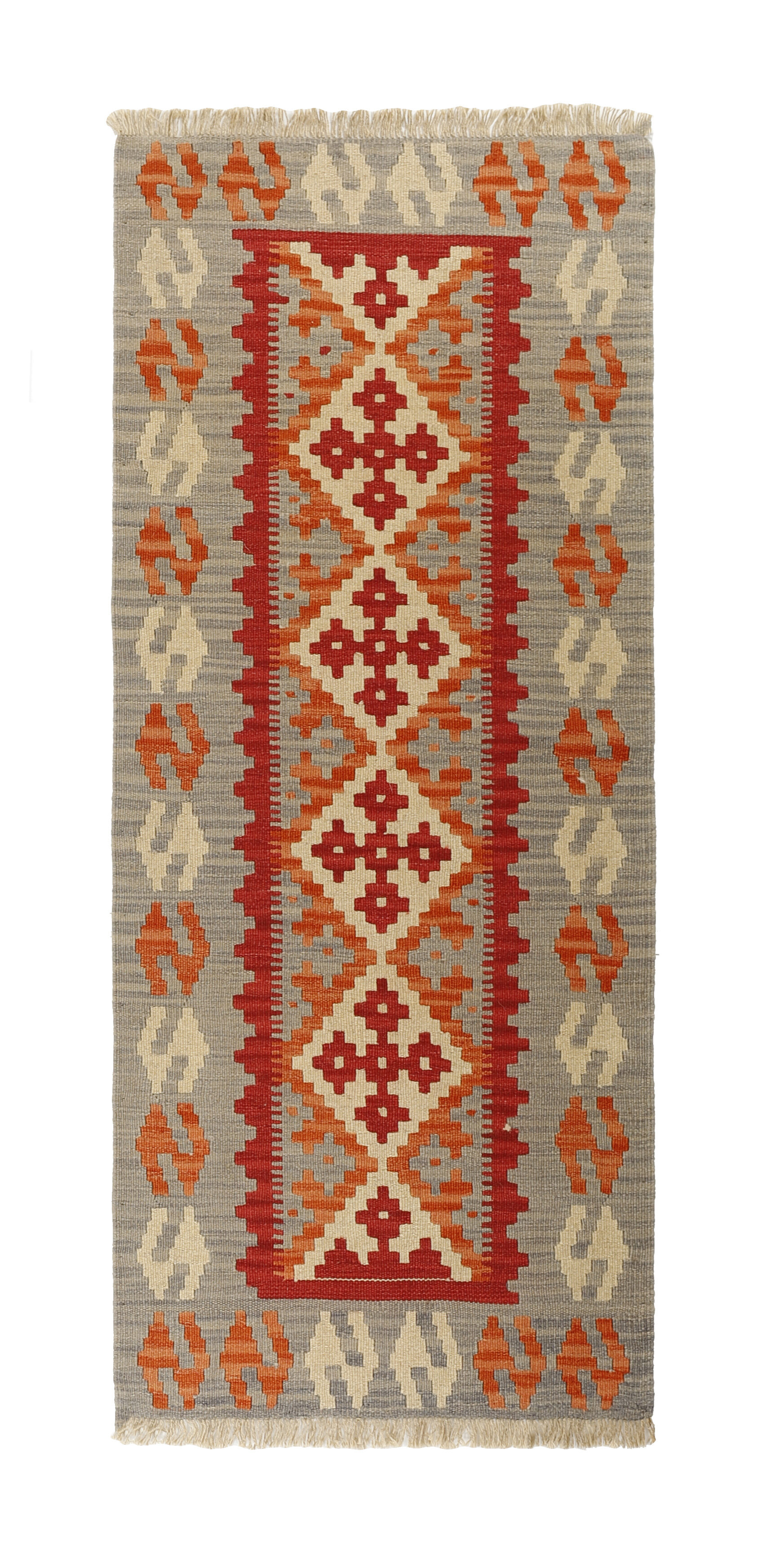 KelimItem no.: 1519234 Size: 82 cm x 194 cmThese Kelims are flat woven rugs, woven by nomads in western Persia. A special weaving technique is used, giving the rug a thinner, flatter surface, with no pile. Kelims are also quicker to produce, compared to common Oriental rugs. The colours are natural and no two rugs are alike. Kelims are produced in several regions and under many names, but the most well known Kelim types are Seneh, Sumak, Fars, and Kelim Gashghai.
