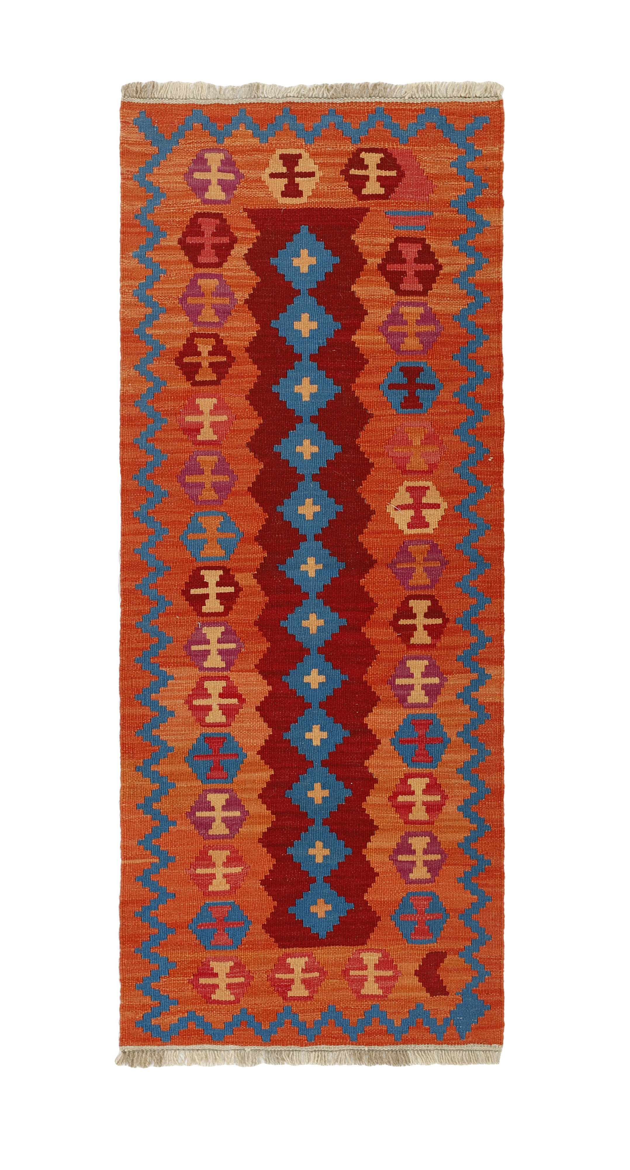 KelimItem no.: 1519238 Size: 70 cm x 192 cmThese Kelims are flat woven rugs, woven by nomads in western Persia. A special weaving technique is used, giving the rug a thinner, flatter surface, with no pile. Kelims are also quicker to produce, compared to common Oriental rugs. The colours are natural and no two rugs are alike. Kelims are produced in several regions and under many names, but the most well known Kelim types are Seneh, Sumak, Fars, and Kelim Gashghai.
