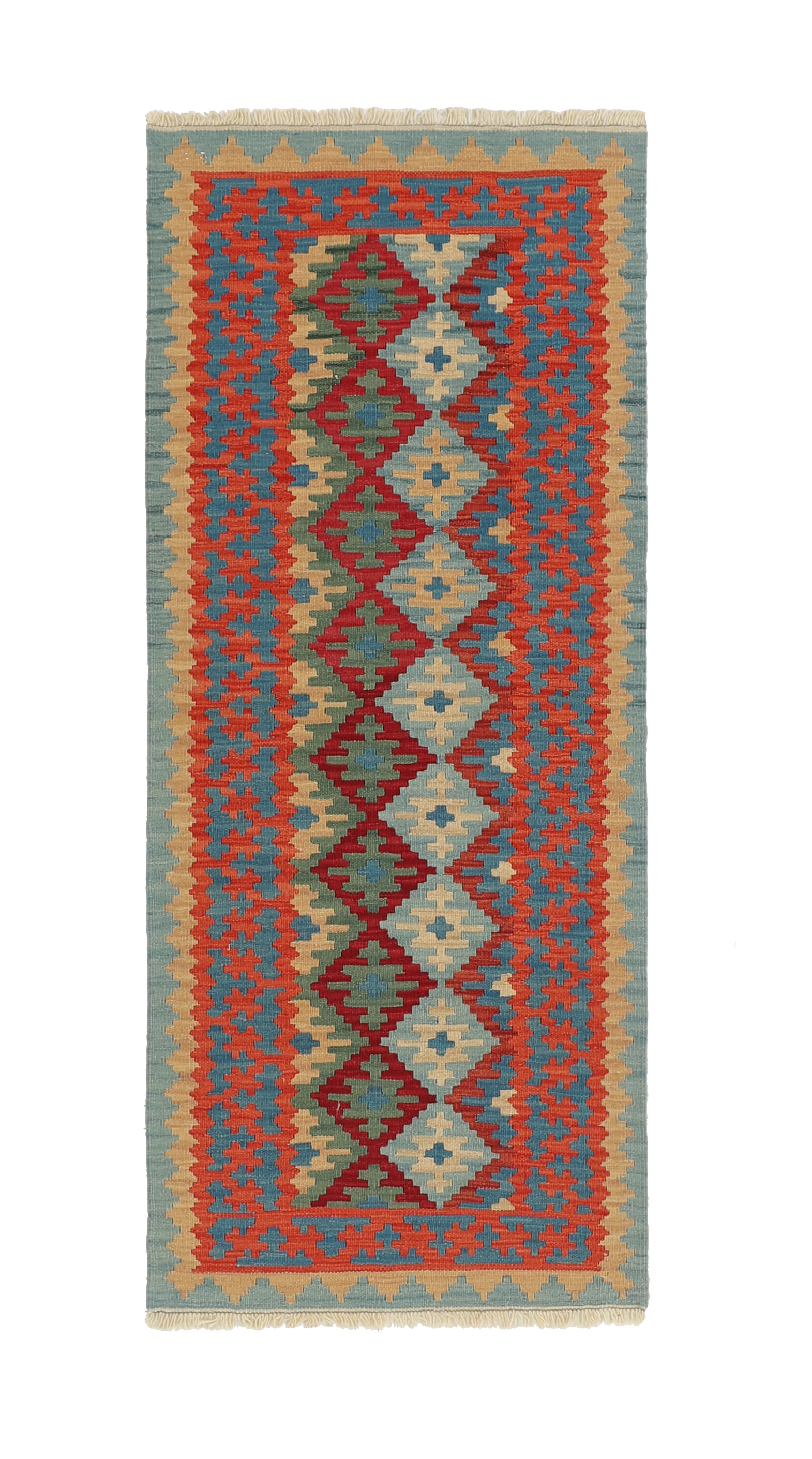 KelimItem no.: 1519242 Size: 82 cm x 196 cmThese Kelims are flat woven rugs, woven by nomads in western Persia. A special weaving technique is used, giving the rug a thinner, flatter surface, with no pile. Kelims are also quicker to produce, compared to common Oriental rugs. The colours are natural and no two rugs are alike. Kelims are produced in several regions and under many names, but the most well known Kelim types are Seneh, Sumak, Fars, and Kelim Gashghai.