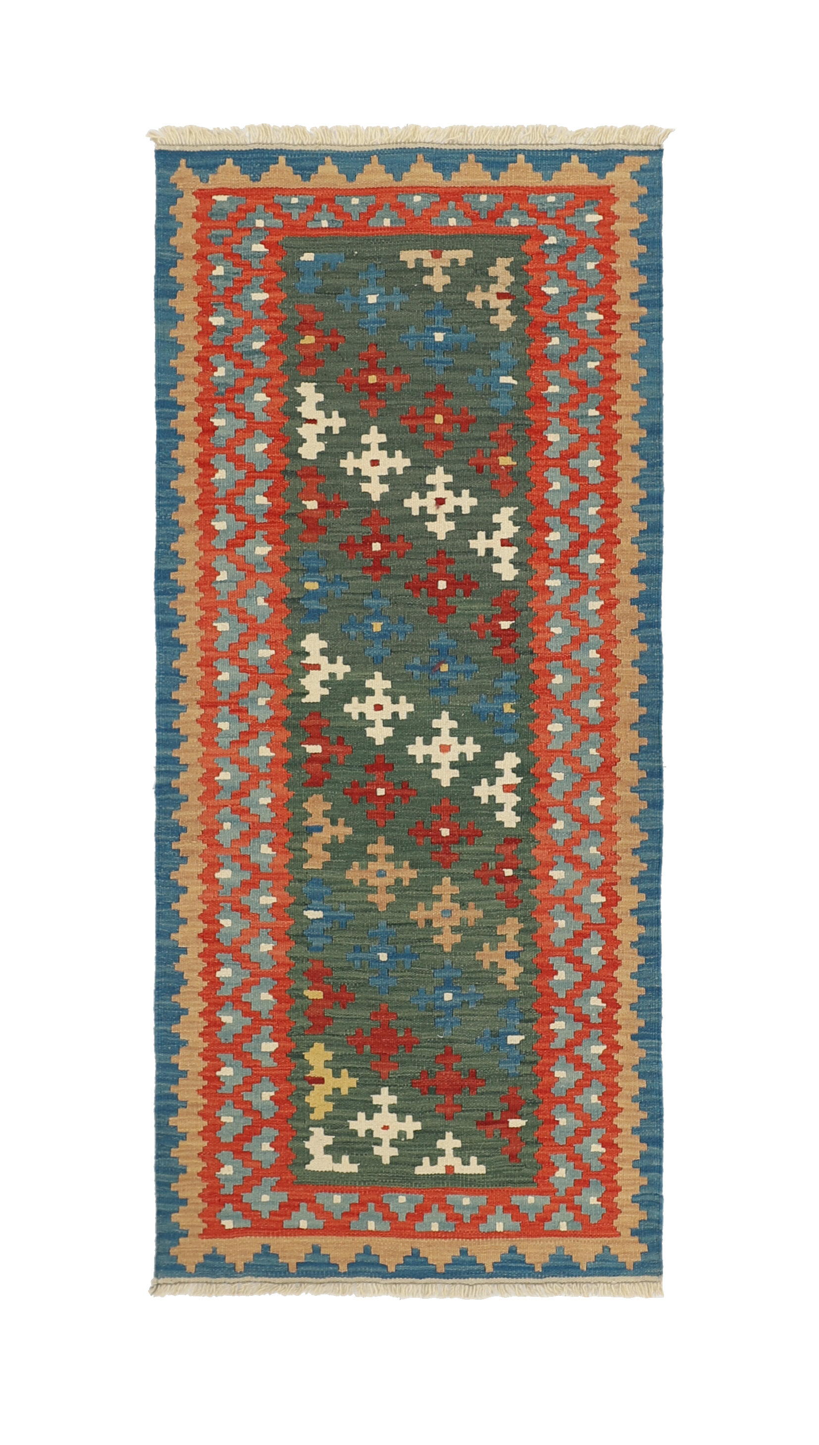 KelimItem no.: 1519245 Size: 81 cm x 195 cmThese Kelims are flat woven rugs, woven by nomads in western Persia. A special weaving technique is used, giving the rug a thinner, flatter surface, with no pile. Kelims are also quicker to produce, compared to common Oriental rugs. The colours are natural and no two rugs are alike. Kelims are produced in several regions and under many names, but the most well known Kelim types are Seneh, Sumak, Fars, and Kelim Gashghai.