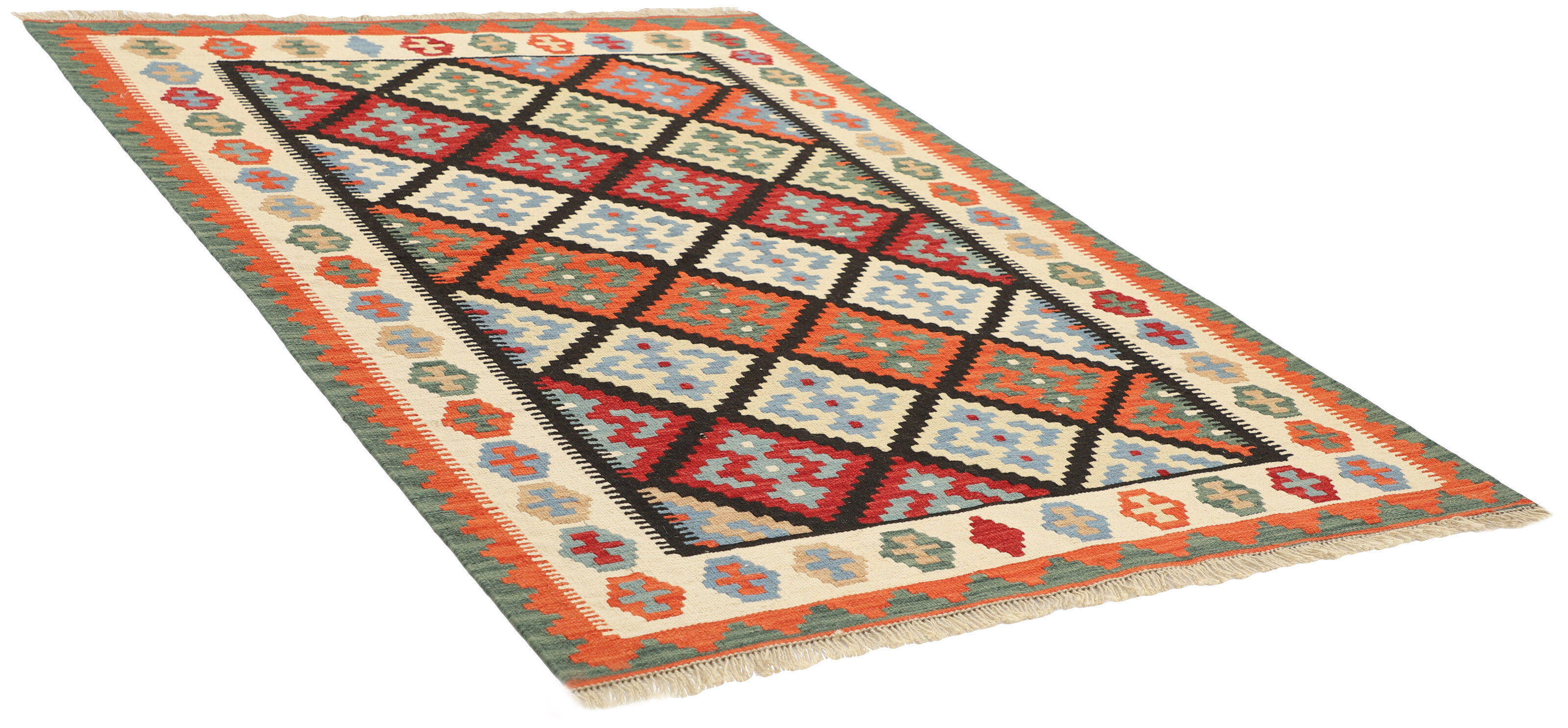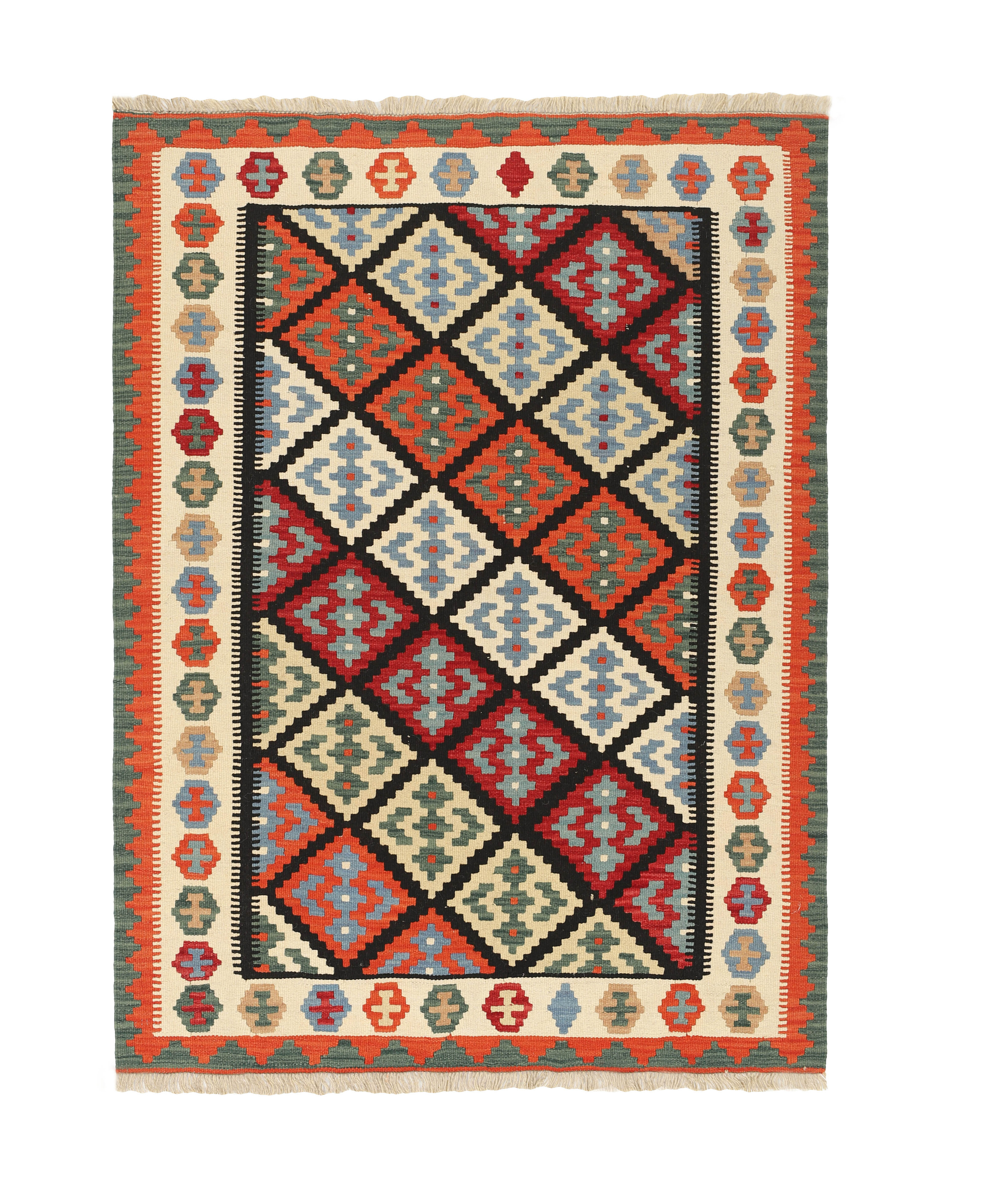 KelimItem no.: 1519247 Size: 125 cm x 181 cmThese Kelims are flat woven rugs, woven by nomads in western Persia. A special weaving technique is used, giving the rug a thinner, flatter surface, with no pile. Kelims are also quicker to produce, compared to common Oriental rugs. The colours are natural and no two rugs are alike. Kelims are produced in several regions and under many names, but the most well known Kelim types are Seneh, Sumak, Fars, and Kelim Gashghai.