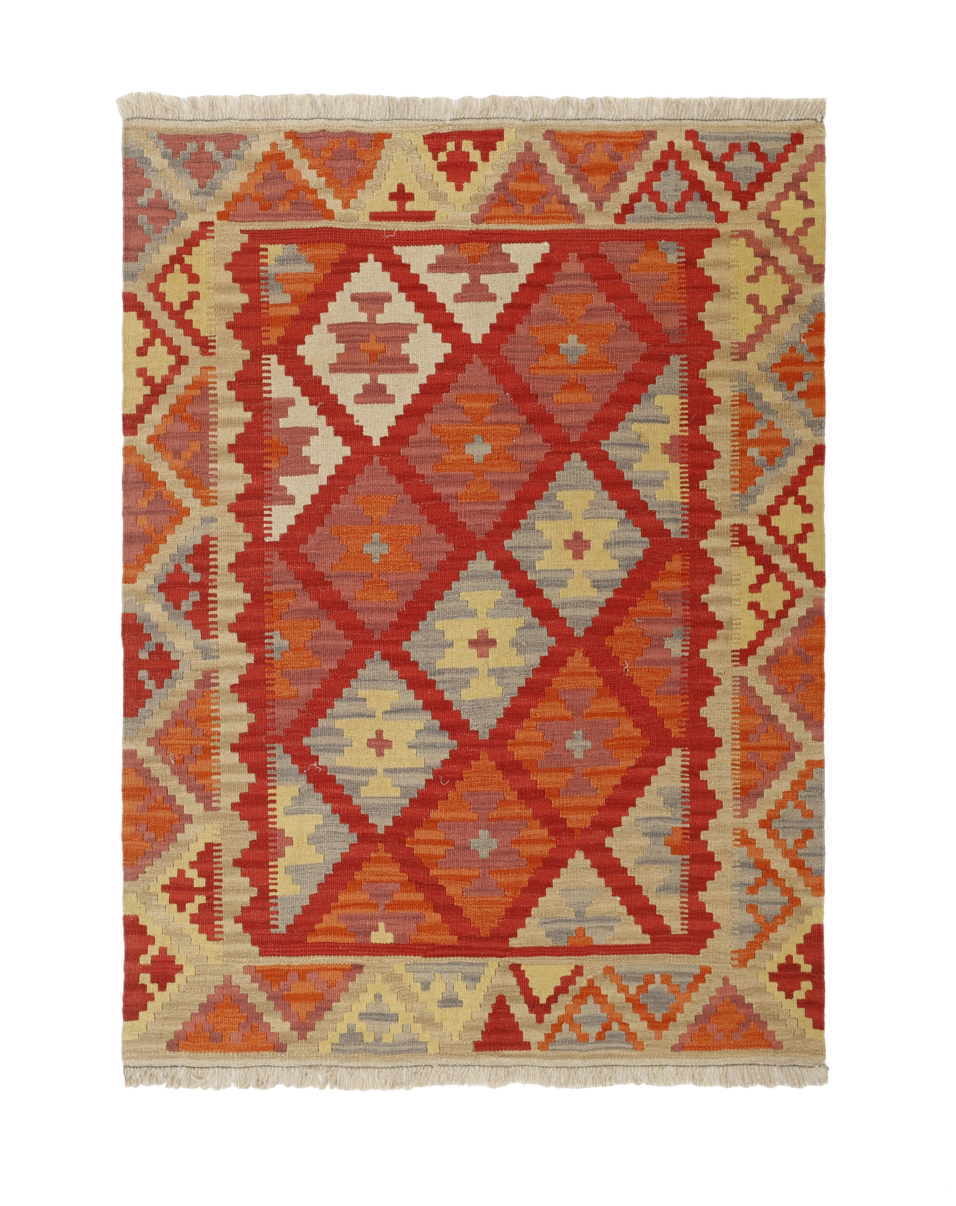 KelimItem no.: 1519257 Size: 130 cm x 175 cmThese Kelims are flat woven rugs, woven by nomads in western Persia. A special weaving technique is used, giving the rug a thinner, flatter surface, with no pile. Kelims are also quicker to produce, compared to common Oriental rugs. The colours are natural and no two rugs are alike. Kelims are produced in several regions and under many names, but the most well known Kelim types are Seneh, Sumak, Fars, and Kelim Gashghai.