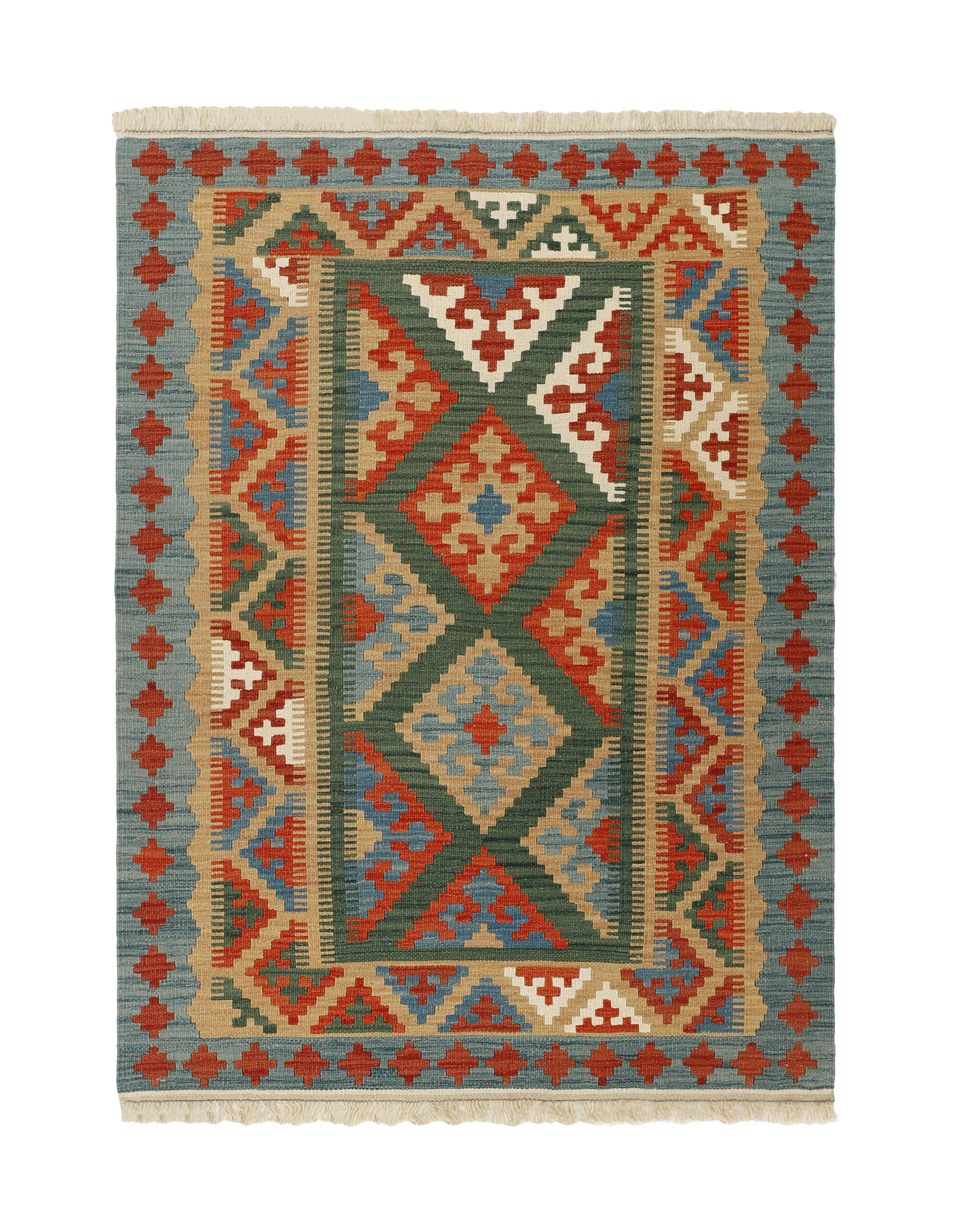 KelimItem no.: 1519269 Size: 129 cm x 173 cmThese Kelims are flat woven rugs, woven by nomads in western Persia. A special weaving technique is used, giving the rug a thinner, flatter surface, with no pile. Kelims are also quicker to produce, compared to common Oriental rugs. The colours are natural and no two rugs are alike. Kelims are produced in several regions and under many names, but the most well known Kelim types are Seneh, Sumak, Fars, and Kelim Gashghai.