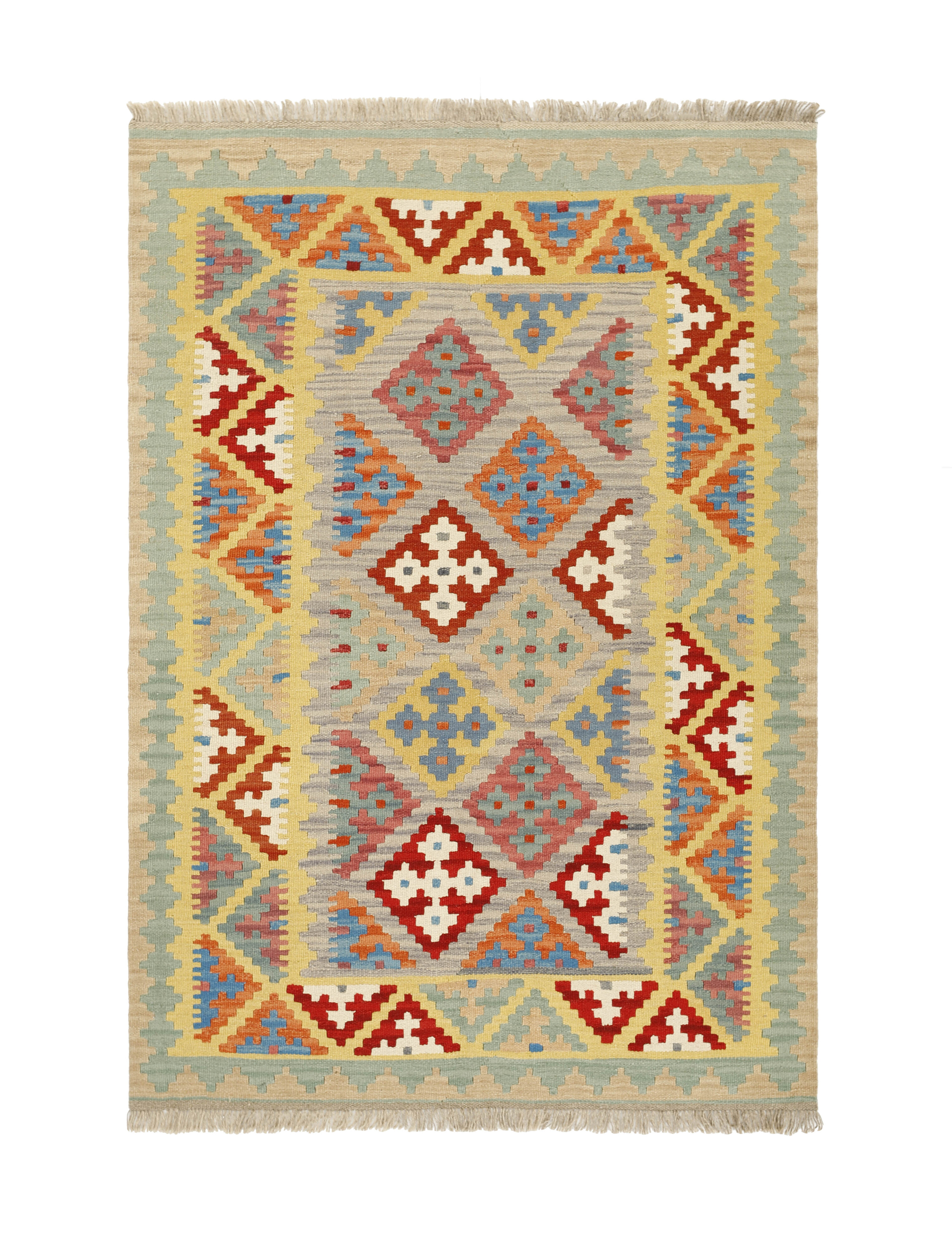 KelimItem no.: 1519273 Size: 123 cm x 177 cmThese Kelims are flat woven rugs, woven by nomads in western Persia. A special weaving technique is used, giving the rug a thinner, flatter surface, with no pile. Kelims are also quicker to produce, compared to common Oriental rugs. The colours are natural and no two rugs are alike. Kelims are produced in several regions and under many names, but the most well known Kelim types are Seneh, Sumak, Fars, and Kelim Gashghai.