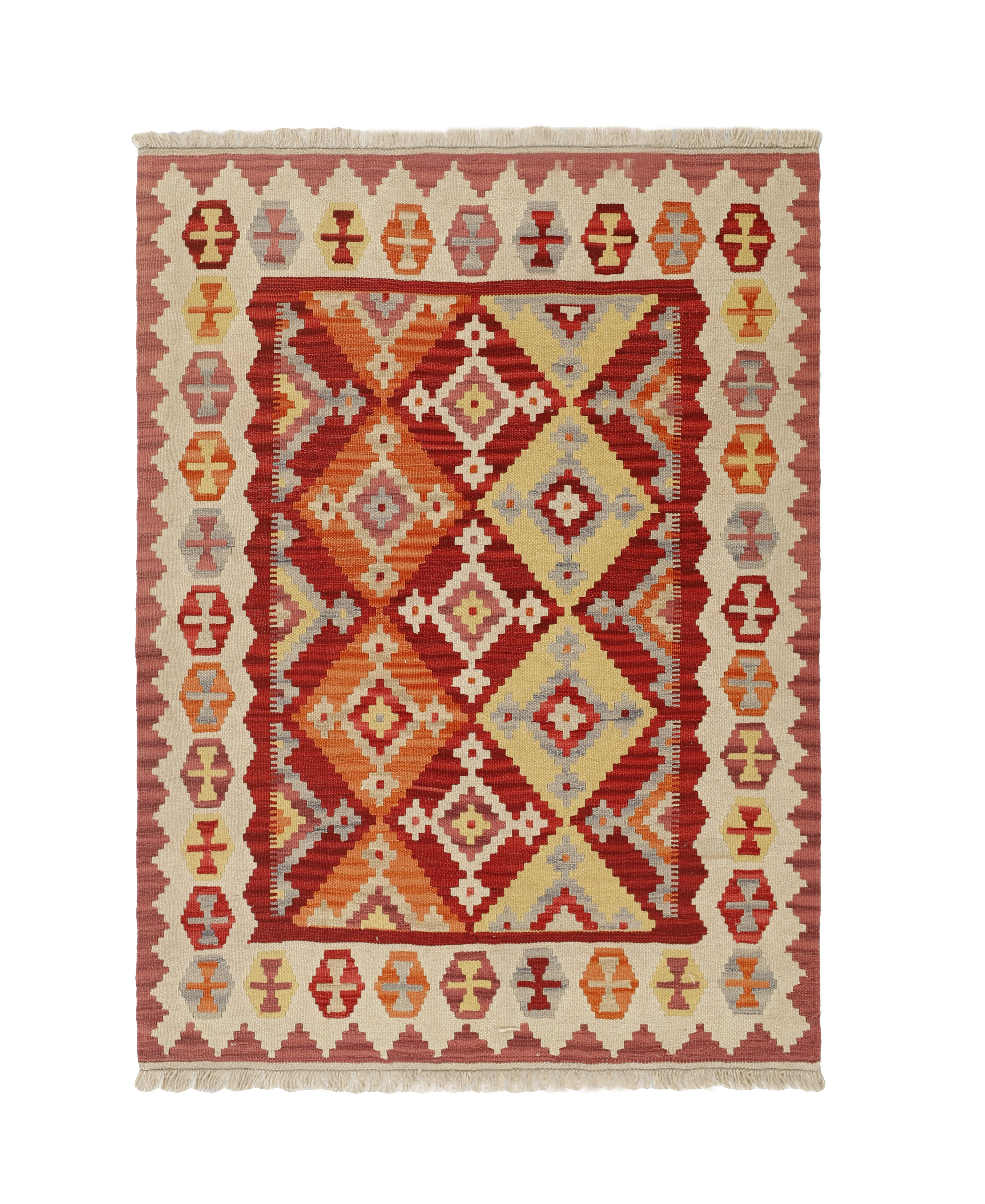 KelimItem no.: 1519295 Size: 129 cm x 174 cmThese Kelims are flat woven rugs, woven by nomads in western Persia. A special weaving technique is used, giving the rug a thinner, flatter surface, with no pile. Kelims are also quicker to produce, compared to common Oriental rugs. The colours are natural and no two rugs are alike. Kelims are produced in several regions and under many names, but the most well known Kelim types are Seneh, Sumak, Fars, and Kelim Gashghai.