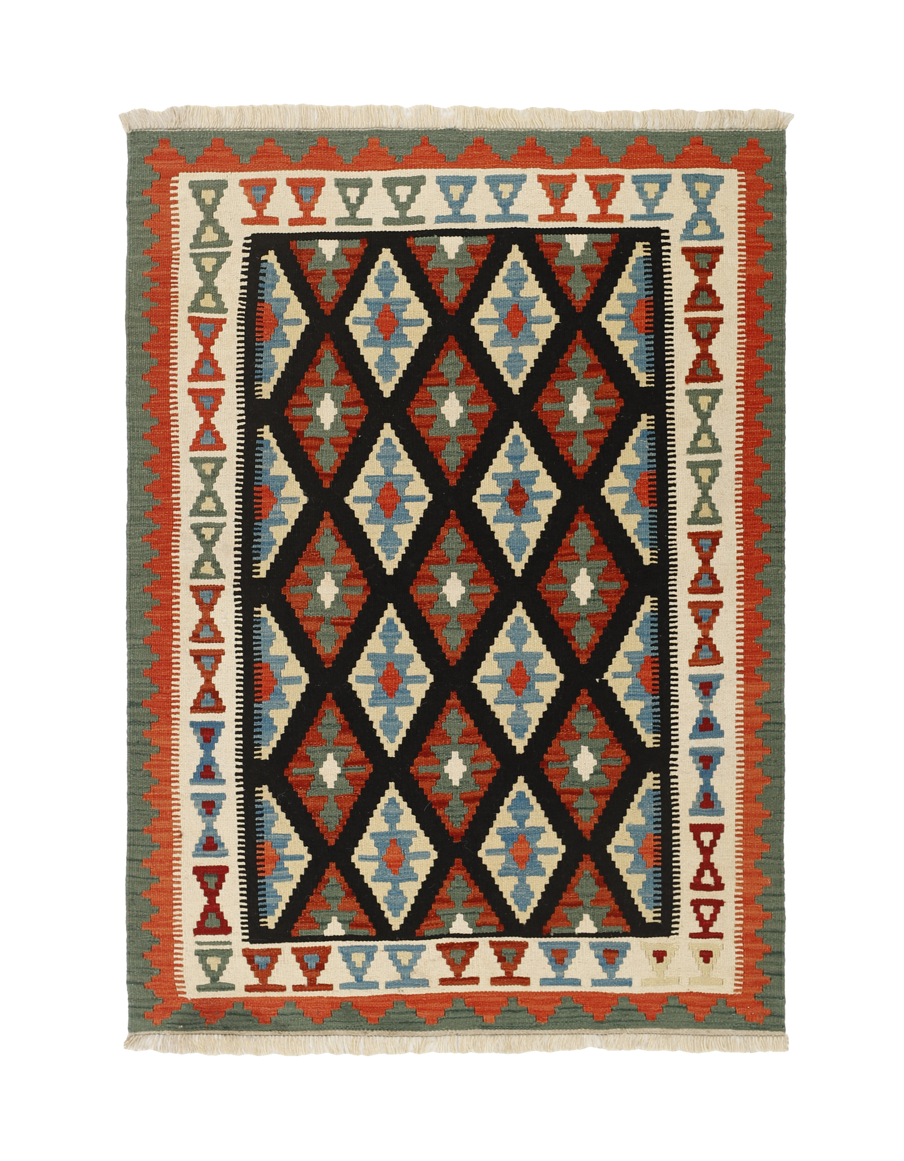 KelimItem no.: 1519297 Size: 126 cm x 174 cmThese Kelims are flat woven rugs, woven by nomads in western Persia. A special weaving technique is used, giving the rug a thinner, flatter surface, with no pile. Kelims are also quicker to produce, compared to common Oriental rugs. The colours are natural and no two rugs are alike. Kelims are produced in several regions and under many names, but the most well known Kelim types are Seneh, Sumak, Fars, and Kelim Gashghai.