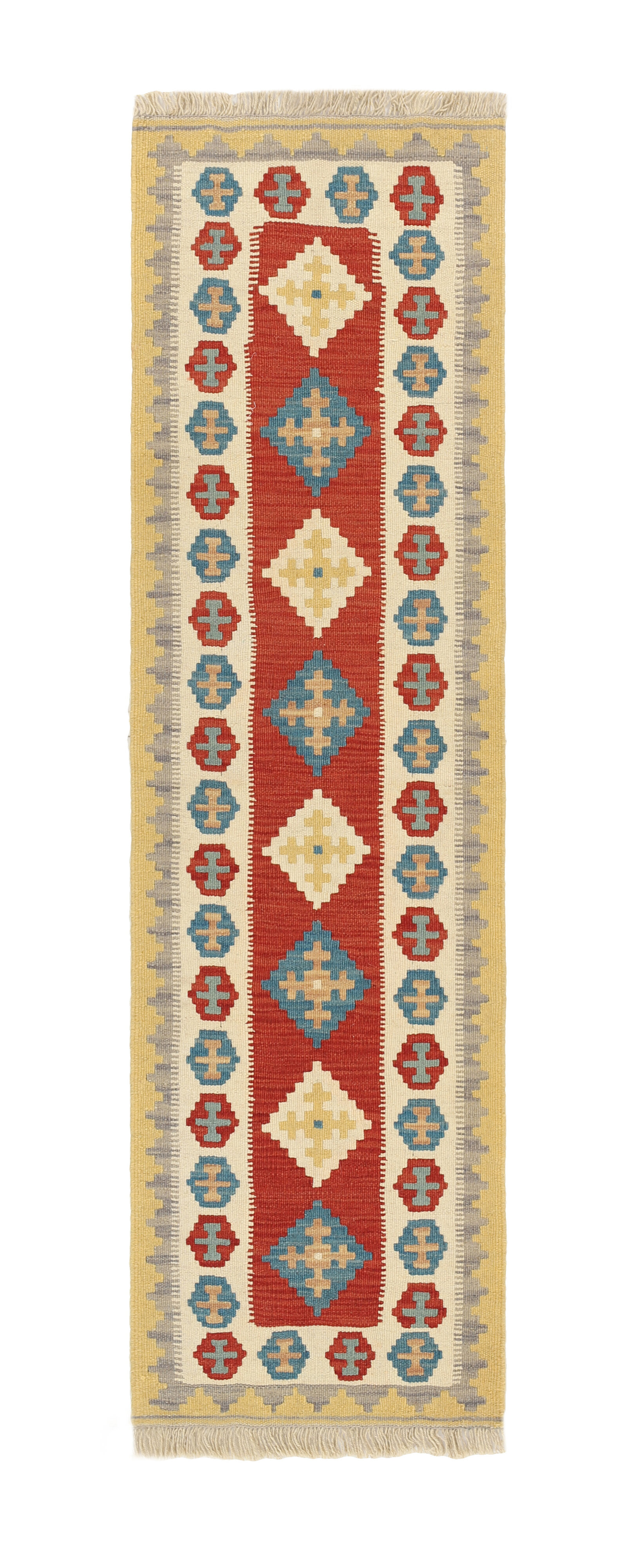 KelimItem no.: 1519474 Size: 55 cm x 195 cmThese Kelims are flat woven rugs, woven by nomads in western Persia. A special weaving technique is used, giving the rug a thinner, flatter surface, with no pile. Kelims are also quicker to produce, compared to common Oriental rugs. The colours are natural and no two rugs are alike. Kelims are produced in several regions and under many names, but the most well known Kelim types are Seneh, Sumak, Fars, and Kelim Gashghai.