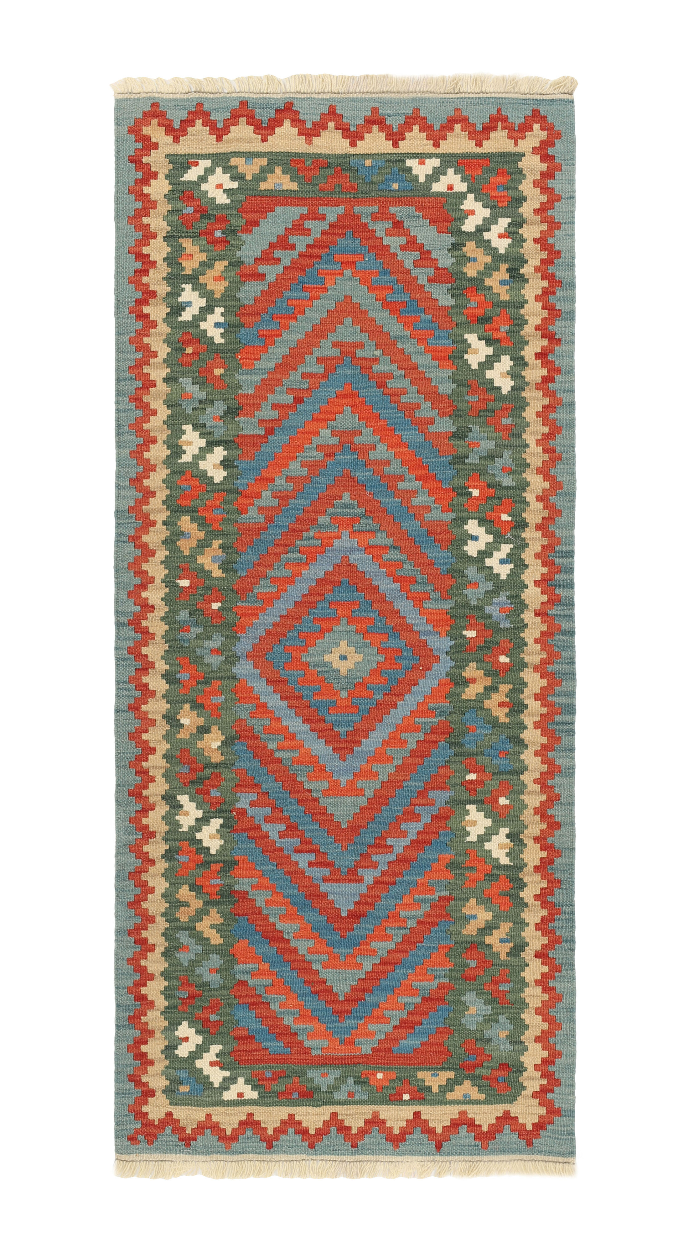 KelimItem no.: 1519477 Size: 85 cm x 196 cmThese Kelims are flat woven rugs, woven by nomads in western Persia. A special weaving technique is used, giving the rug a thinner, flatter surface, with no pile. Kelims are also quicker to produce, compared to common Oriental rugs. The colours are natural and no two rugs are alike. Kelims are produced in several regions and under many names, but the most well known Kelim types are Seneh, Sumak, Fars, and Kelim Gashghai.