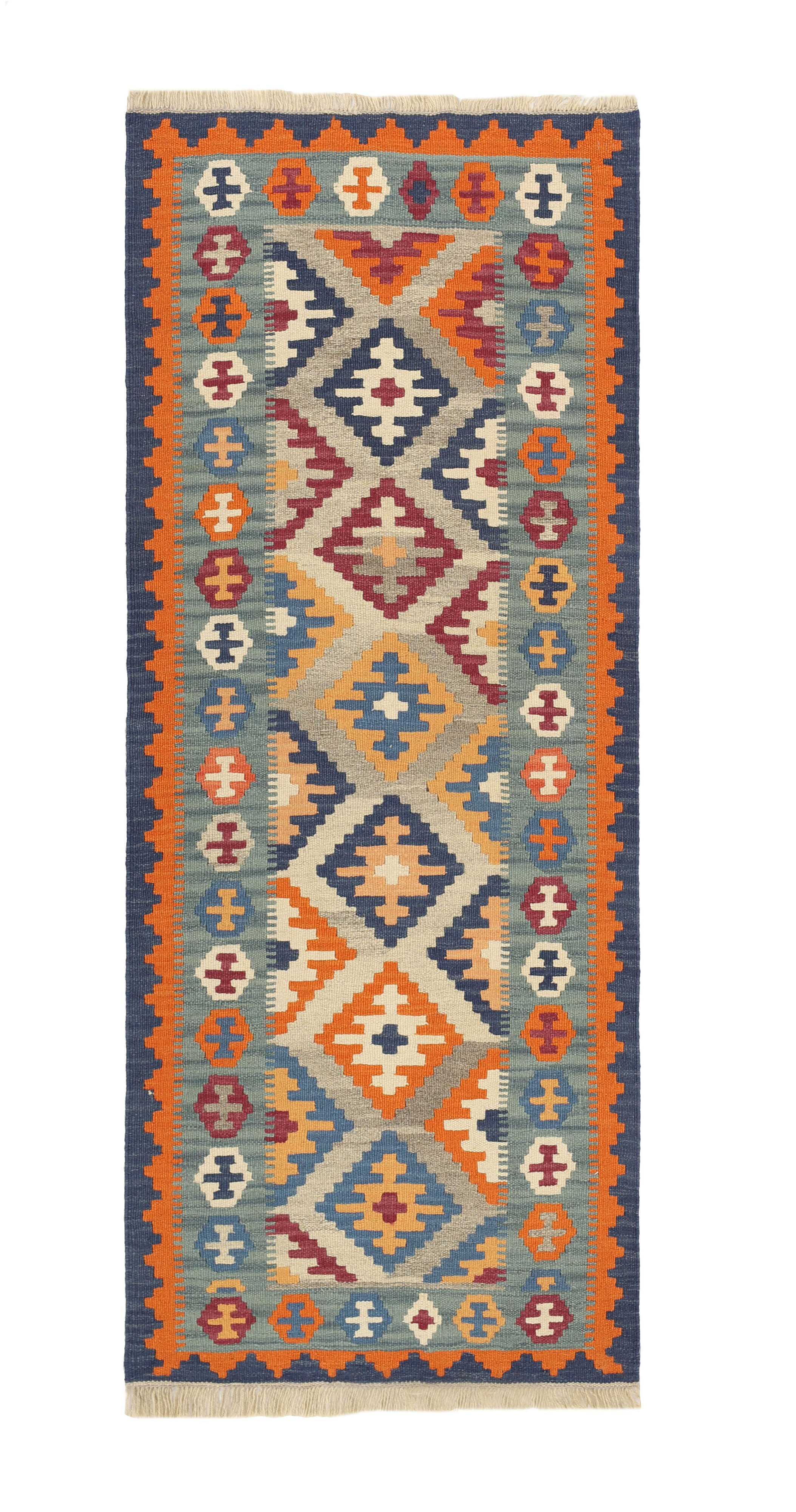 KelimItem no.: 1519479 Size: 79 cm x 203 cmThese Kelims are flat woven rugs, woven by nomads in western Persia. A special weaving technique is used, giving the rug a thinner, flatter surface, with no pile. Kelims are also quicker to produce, compared to common Oriental rugs. The colours are natural and no two rugs are alike. Kelims are produced in several regions and under many names, but the most well known Kelim types are Seneh, Sumak, Fars, and Kelim Gashghai.