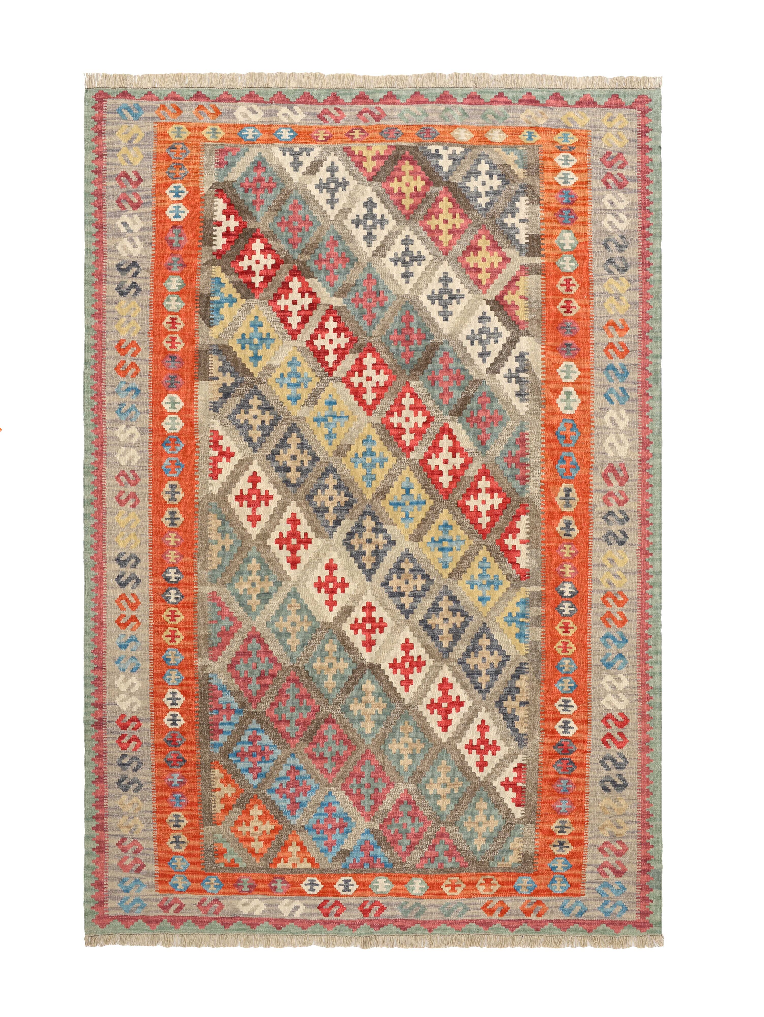 KelimItem no.: 1519487 Size: 208 cm x 300 cmThese Kelims are flat woven rugs, woven by nomads in western Persia. A special weaving technique is used, giving the rug a thinner, flatter surface, with no pile. Kelims are also quicker to produce, compared to common Oriental rugs. The colours are natural and no two rugs are alike. Kelims are produced in several regions and under many names, but the most well known Kelim types are Seneh, Sumak, Fars, and Kelim Gashghai.