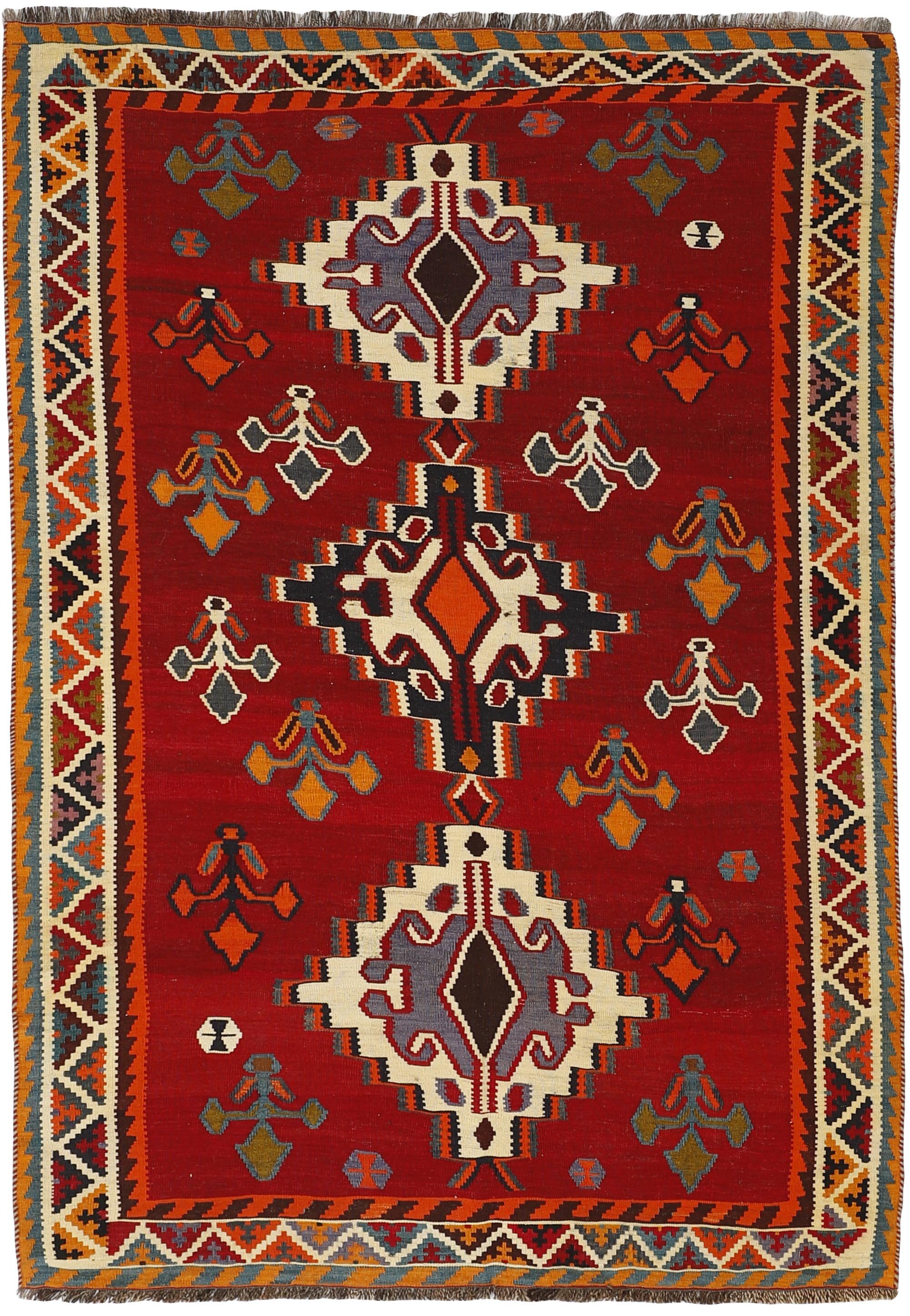 Kelim OldItem no.: 1486842 Size: 155 cm x 228 cmPersian Kelim Old are often oblong, and were originally used in tents by the nomads. Kelim rugs are often placed on top of other rugs as insulation. The rugs are often up to 50 years old, sometimes more than 80 years. The nomads knot or weave the rugs they need themselves, and use them for many different purposes, such as saddlebags for camels and donkeys, but they are mostly used for motorbikes, storing clothes, for sitting on, and as sleeping blankets.