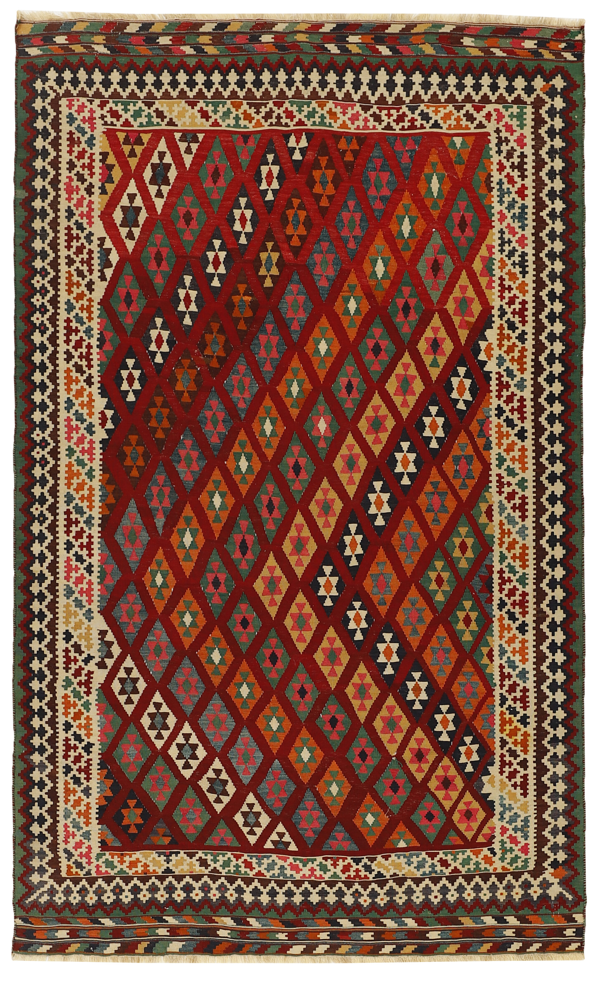 Kelim OldItem no.: 1514884 Size: 150 cm x 255 cmPersian Kelim Old are often oblong, and were originally used in tents by the nomads. Kelim rugs are often placed on top of other rugs as insulation. The rugs are often up to 50 years old, sometimes more than 80 years. The nomads knot or weave the rugs they need themselves, and use them for many different purposes, such as saddlebags for camels and donkeys, but they are mostly used for motorbikes, storing clothes, for sitting on, and as sleeping blankets.