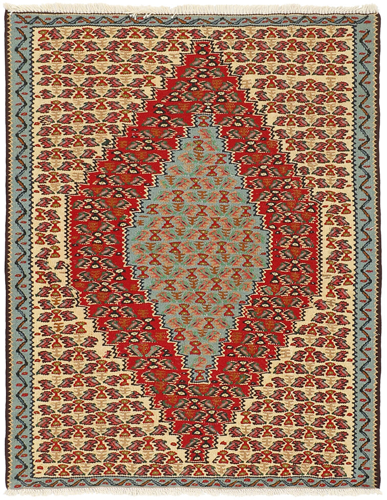 Kelim SenehItem no.: 1275379 Size: 80 cm x 101 cmThese Kelims are flat woven rugs, woven by nomads in western Persia. A special weaving technique is used, giving the rug a thinner, flatter surface, with no pile. Kelims are also quicker to produce, compared to common Oriental rugs. The colours are natural and no two rugs are alike. Kelims are produced in several regions and under many names, but the most well-known Kelim types are Seneh, Sumak, Fars, and Kelim Gashghai.