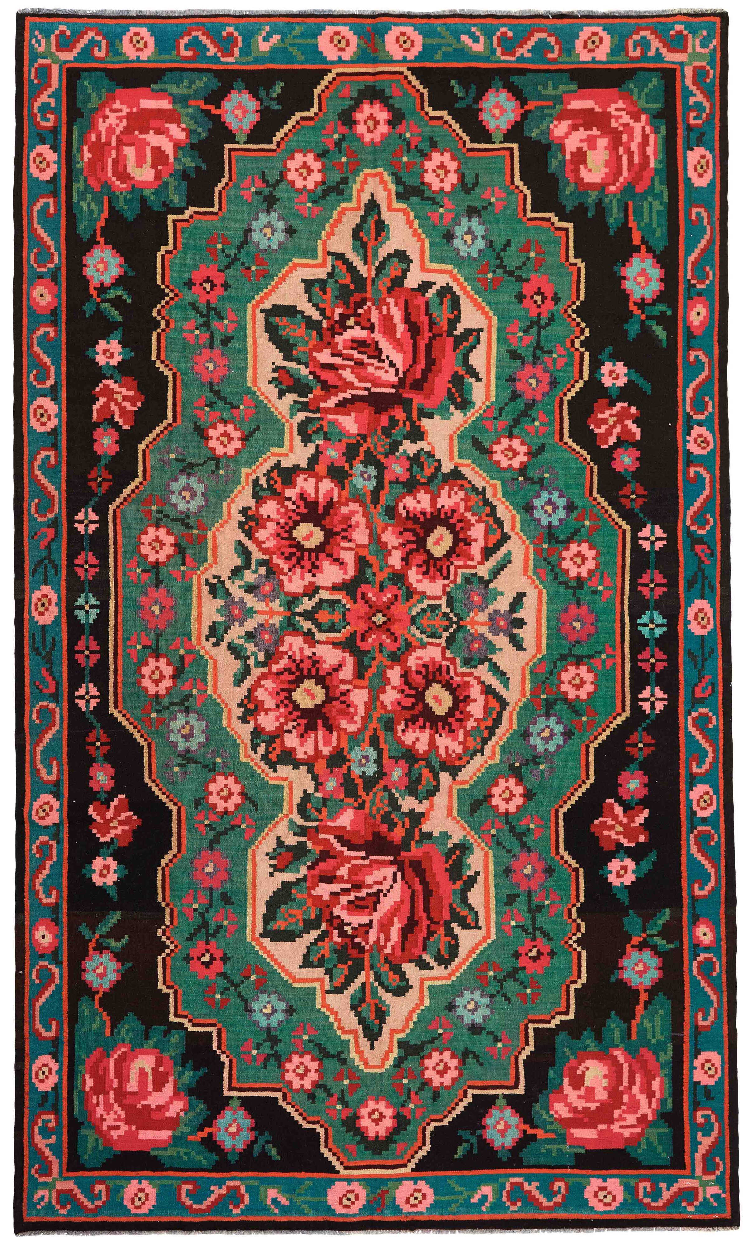 Rose Kelims are produced in Moldavia and northern Turkey. Rose Kelims are woven using a special weaving technique, giving the rugs a thinner, felt-like quality. Rose Kelim are older rugs and can easily be up to 50 years old. They are relatively rare and are hard to get hold of. The motifs are typically very flowered, in strong colours on a dark background.