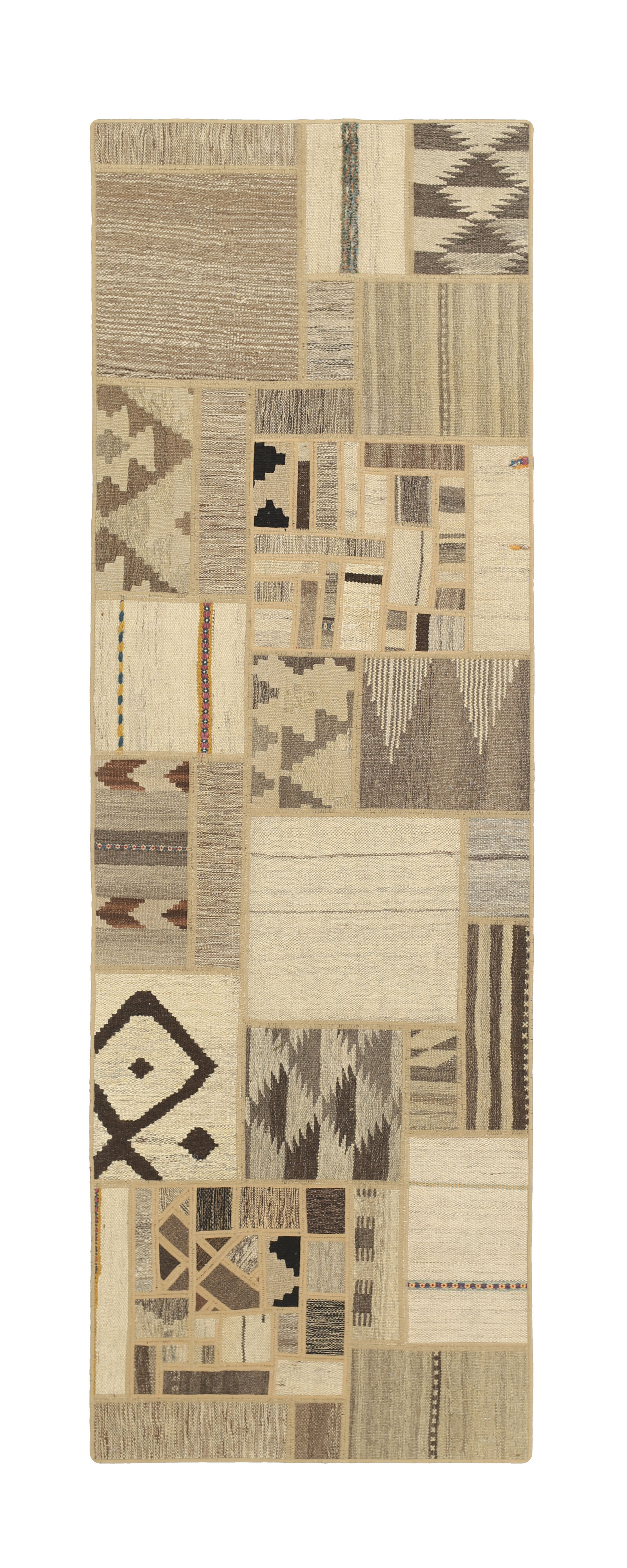Tekkeh Kelims are produced from older Persian Kelims that have been cut into smaller pieces, sewn together, and given a back cover. Tekkeh means piece, so Tekkeh Kelim means a patchwork rug where many pieces have been sewn together. Tekkeh Kelims are available in many sizes and have thoroughly unique patterns. The rugs are produced from 20-50 year old Kelims. Kelim rugs are hand woven rugs that are made using a special weaving technique, giving the rugs a thinner, felt-like quality. Tekkeh Kelim is produced of older Persian kelim, cut into smaller pieces, sown together and with a backside applied. Tekkeh is the Persian name for pieces, and Tekkeh kelim is an expression for a patchwork rug, where several pieces are sown together. Tekkeh Kelim is available in many sizes and all pieces has unique patterns. used a special weaving technique, that gives the rug a thinner and felt like quality.