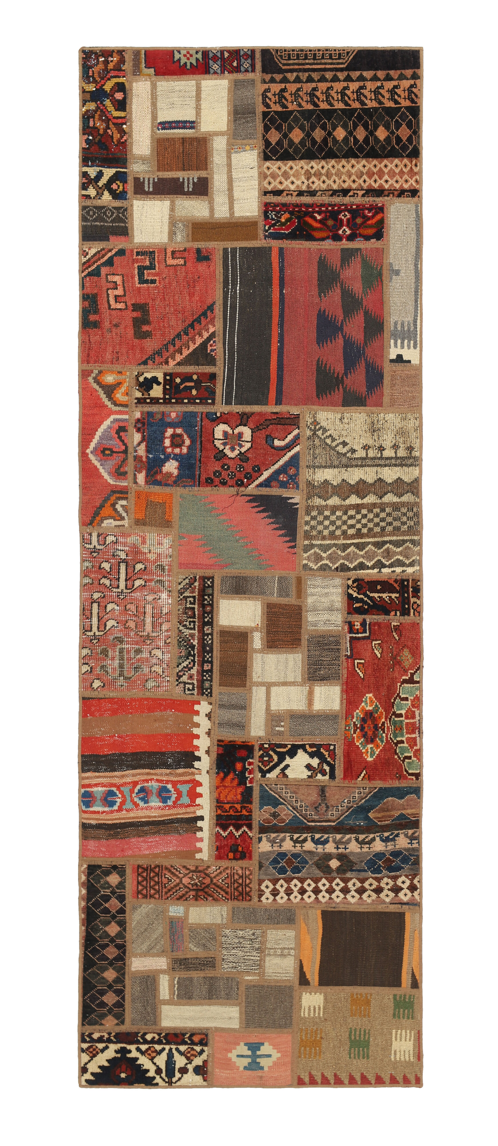 Tekkeh Kelims are produced from older Persian Kelims that have been cut into smaller pieces, sewn together, and given a back cover. Tekkeh means piece, so Tekkeh Kelim means a patchwork rug where many pieces have been sewn together. Tekkeh Kelims are available in many sizes and have thoroughly unique patterns. The rugs are produced from 20-50 year old Kelims. Kelim rugs are hand woven rugs that are made using a special weaving technique, giving the rugs a thinner, felt-like quality. Tekkeh Kelim is produced of older Persian kelim, cut into smaller pieces, sown together and with a backside applied. Tekkeh is the Persian name for pieces, and Tekkeh kelim is an expression for a patchwork rug, where several pieces are sown together. Tekkeh Kelim is available in many sizes and all pieces has unique patterns. used a special weaving technique, that gives the rug a thinner and felt like quality.