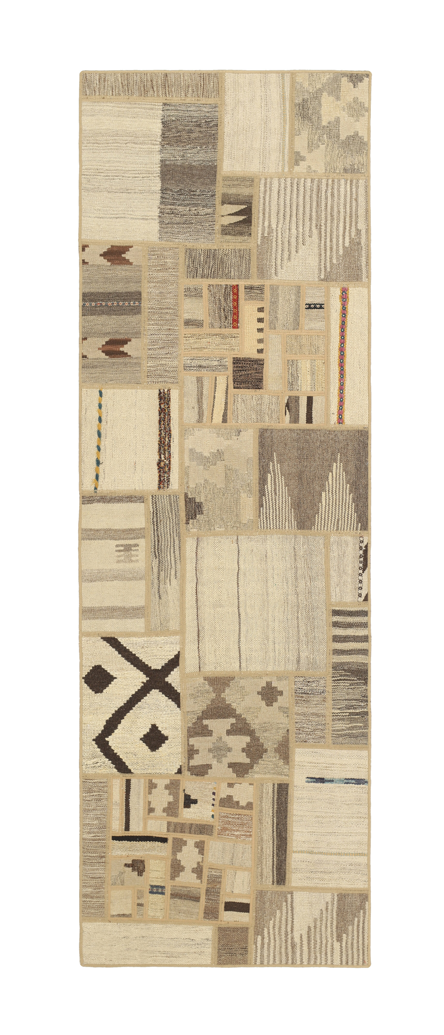 Tekkeh Kelims are produced from older Persian Kelims that have been cut into smaller pieces, sewn together, and given a back cover. Tekkeh means piece, so Tekkeh Kelim means a patchwork rug where many pieces have been sewn together. Tekkeh Kelims are available in many sizes and have thoroughly unique patterns. The rugs are produced from 20-50 year old Kelims. Kelim rugs are hand woven rugs that are made using a special weaving technique, giving the rugs a thinner, felt-like quality. Tekkeh Kelim is produced of older Persian kelim, cut into smaller pieces, sown together and with a backside applied. Tekkeh is the Persian name for pieces, and Tekkeh kelim is an expression for a patchwork rug, where several pieces are sown together. Tekkeh Kelim is available in many sizes and all pieces has unique patterns. used a special weaving technique, that gives the rug a thinner and felt like quality.