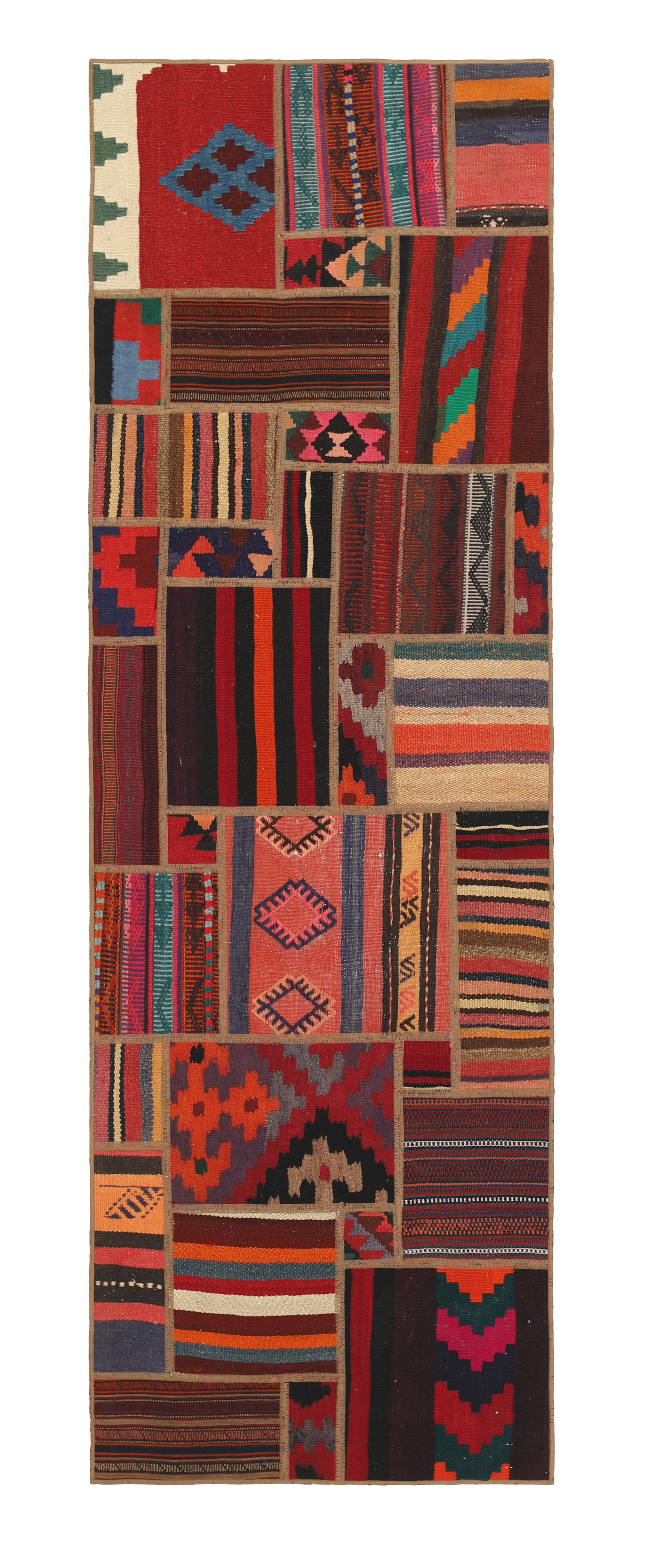 Tekkeh Kelims are produced from older Persian Kelims that have been cut into smaller pieces, sewn together, and given a back cover. Tekkeh means piece, so Tekkeh Kelim means a patchwork rug where many pieces have been sewn together. Tekkeh Kelims are available in many sizes and have thoroughly unique patterns. The rugs are produced from 20-50 year old Kelims. Kelim rugs are hand woven rugs that are made using a special weaving technique, giving the rugs a thinner, felt-like quality. Tekkeh Kelim is produced of older Persian kelim, cut into smaller pieces, sown together and with a backside applied. Tekkeh is the Persian name for pieces, and Tekkeh kelim is an expression for a patchwork rug, where several pieces are sown together. Tekkeh Kelim is available in many sizes and all pieces has unique patterns. used a special weaving technique, that gives the rug a thinner and felt like quality.