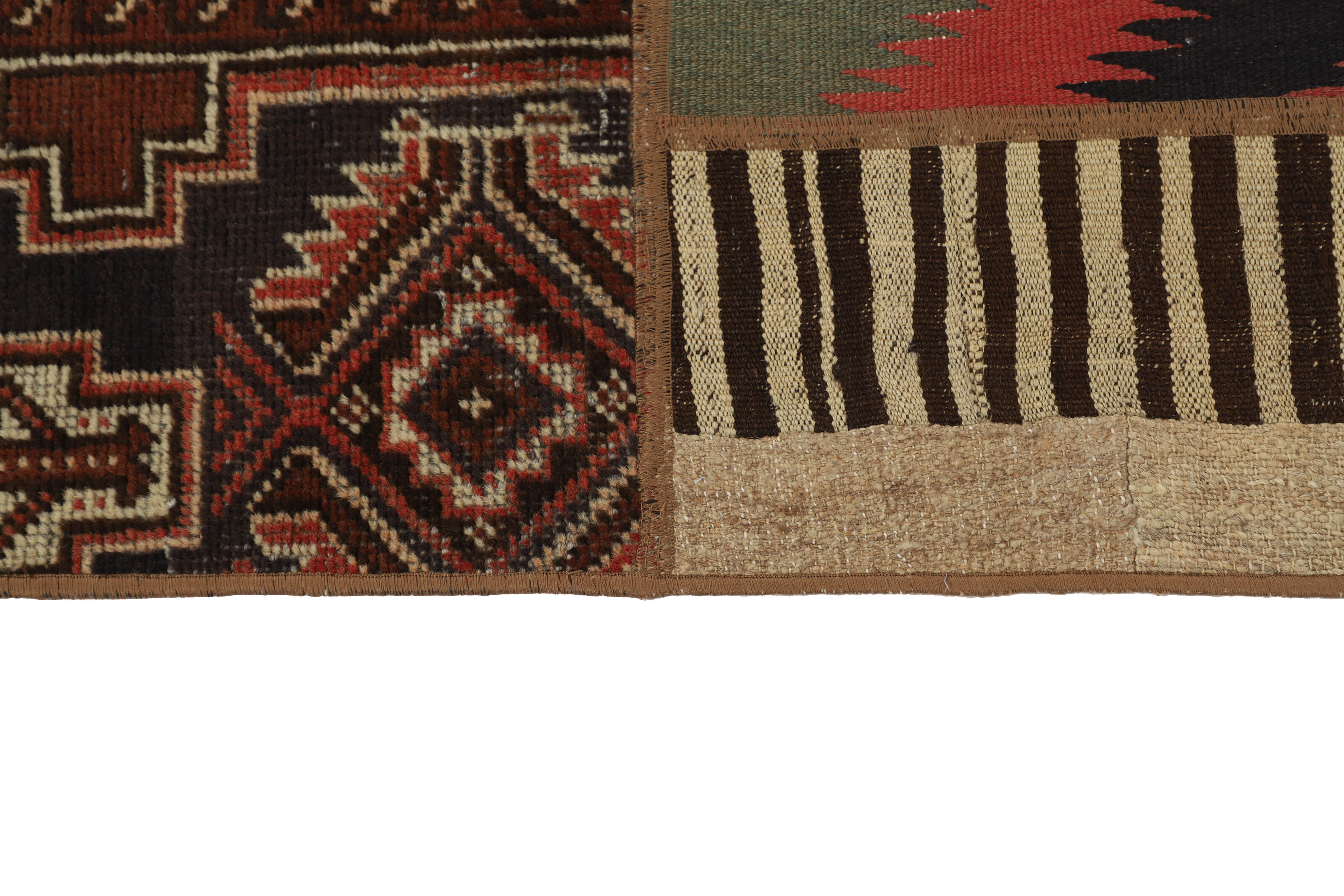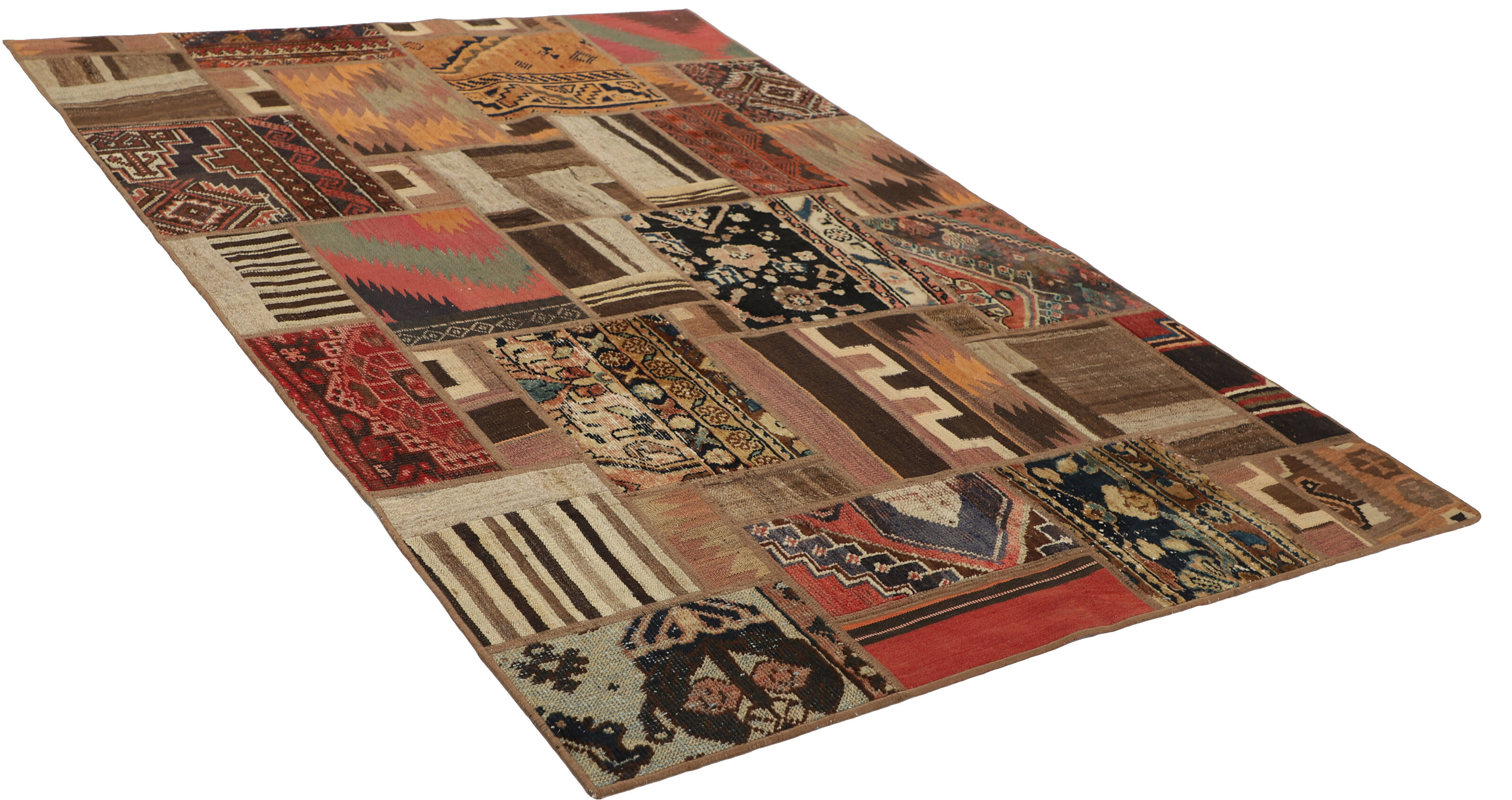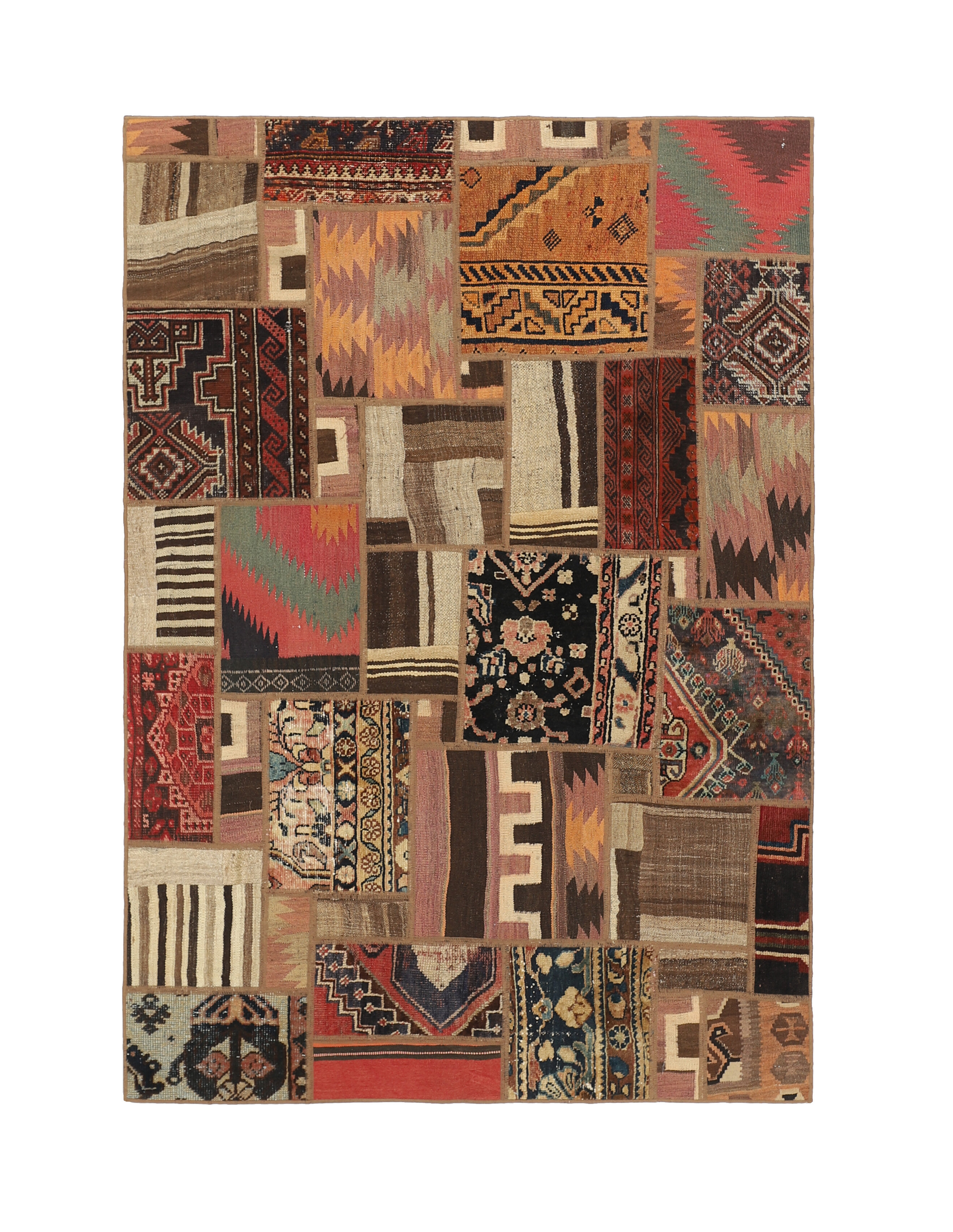Tekkeh Kelims are produced from older Persian Kelims that have been cut into smaller pieces, sewn together, and given a back cover. Tekkeh means piece, so Tekkeh Kelim means a patchwork rug where many pieces have been sewn together. Tekkeh Kelims are available in many sizes and have thoroughly unique patterns. The rugs are produced from 20-50 year old Kelims. Kelim rugs are hand woven rugs that are made using a special weaving technique, giving the rugs a thinner, felt-like quality. Tekkeh Kelim is produced of older Persian kelim, cut into smaller pieces, sown together and with a backside applied. Tekkeh is the Persian name for pieces, and Tekkeh kelim is an expression for a patchwork rug, where several pieces are sown together. Tekkeh Kelim is available in many sizes and all pieces has unique patterns. used a special weaving technique, that gives the rug a thinner and felt like quality.