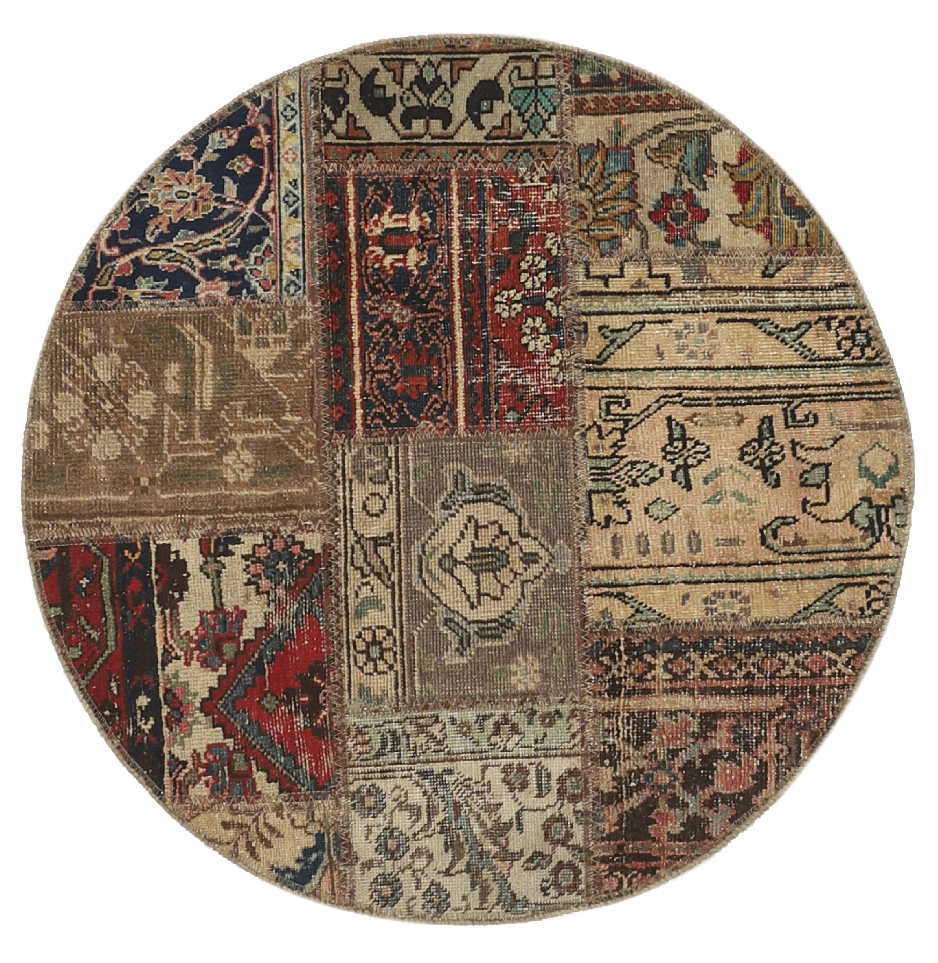 Vintage PatchworkItem no.: 1521828 Size: 100 cm x 100 cmVintage Royals are antique hand knotted rugs of Persian origin. The Patchwork Collection consists of old rugs that have been beyond repair, and instead cut into smaller pieces and used for patchwork. The Patchwork pieces are stonewashed and recoloured in light, dark, or bright colours, with the old pattern just being visible. The Patchwork rug forms a whole new and unique design. The rugs are of a very high quality and are available in large sizes. With the Vintage Royal Patchwork Collection, you do not just get a rug; you adorn your home with a unique piece of antique, Persian handcraft.