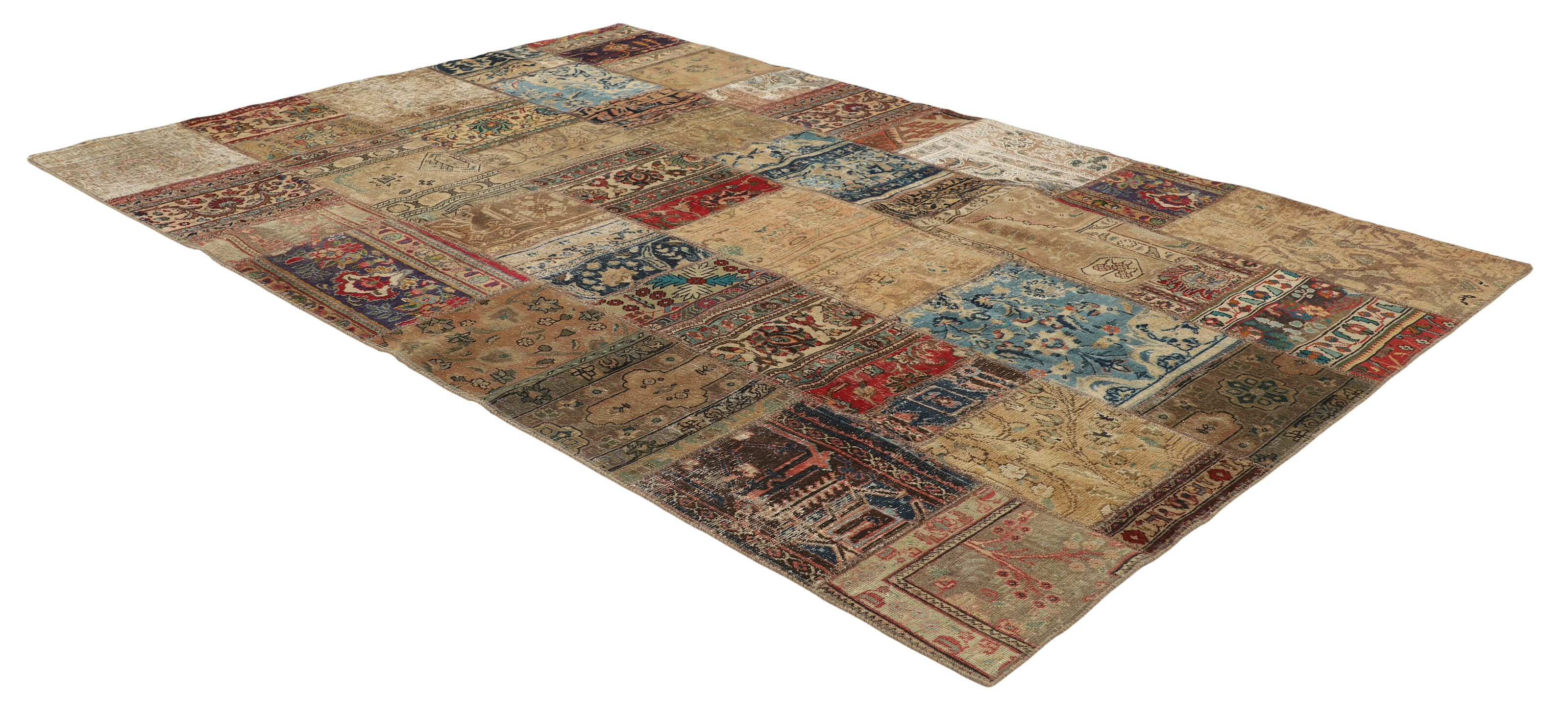 Vintage PatchworkItem no.: 1521870 Size: 208 cm x 310 cmVintage Royals are antique hand knotted rugs of Persian origin. The Patchwork Collection consists of old rugs that have been beyond repair, and instead cut into smaller pieces and used for patchwork. The Patchwork pieces are stonewashed and recoloured in light, dark, or bright colours, with the old pattern just being visible. The Patchwork rug forms a whole new and unique design. The rugs are of a very high quality and are available in large sizes. With the Vintage Royal Patchwork Collection, you do not just get a rug; you adorn your home with a unique piece of antique, Persian handcraft.