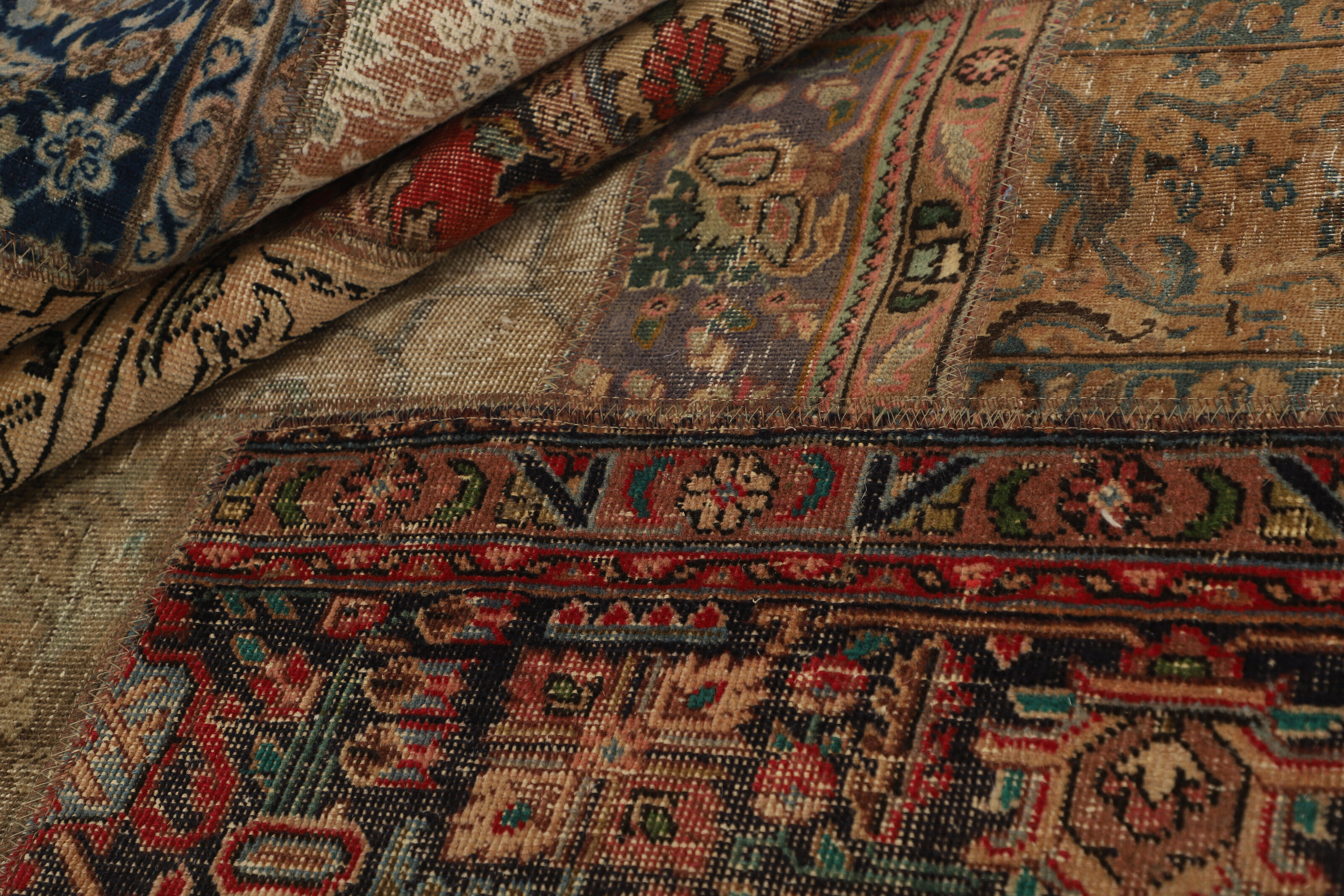 Vintage PatchworkItem no.: 1521873 Size: 254 cm x 360 cmVintage Royals are antique hand knotted rugs of Persian origin. The Patchwork Collection consists of old rugs that have been beyond repair, and instead cut into smaller pieces and used for patchwork. The Patchwork pieces are stonewashed and recoloured in light, dark, or bright colours, with the old pattern just being visible. The Patchwork rug forms a whole new and unique design. The rugs are of a very high quality and are available in large sizes. With the Vintage Royal Patchwork Collection, you do not just get a rug; you adorn your home with a unique piece of antique, Persian handcraft.