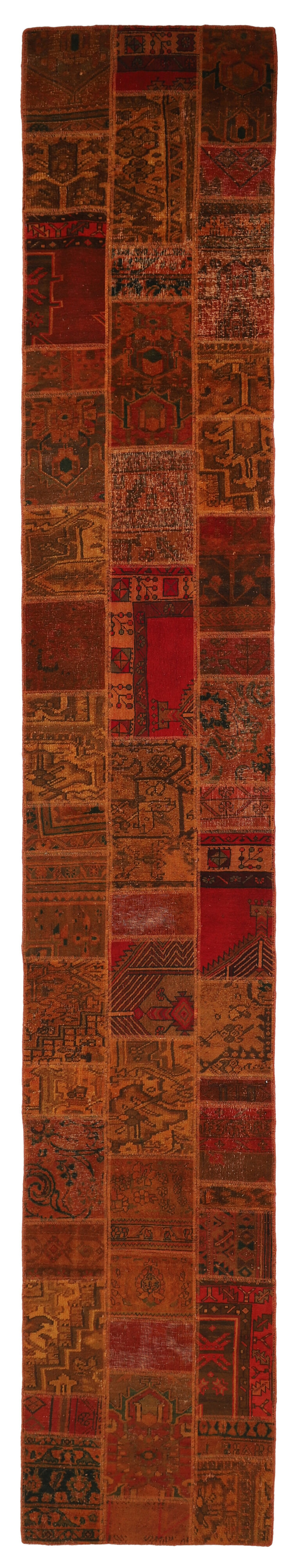 Vintage PatchworkItem no.: 1521947 Size: 80 cm x 505 cmVintage Royals are antique hand knotted rugs of Persian origin. The Patchwork Collection consists of old rugs that have been beyond repair, and instead cut into smaller pieces and used for patchwork. The Patchwork pieces are stonewashed and recoloured in light, dark, or bright colours, with the old pattern just being visible. The Patchwork rug forms a whole new and unique design. The rugs are of a very high quality and are available in large sizes. With the Vintage Royal Patchwork Collection, you do not just get a rug; you adorn your home with a unique piece of antique, Persian handcraft.