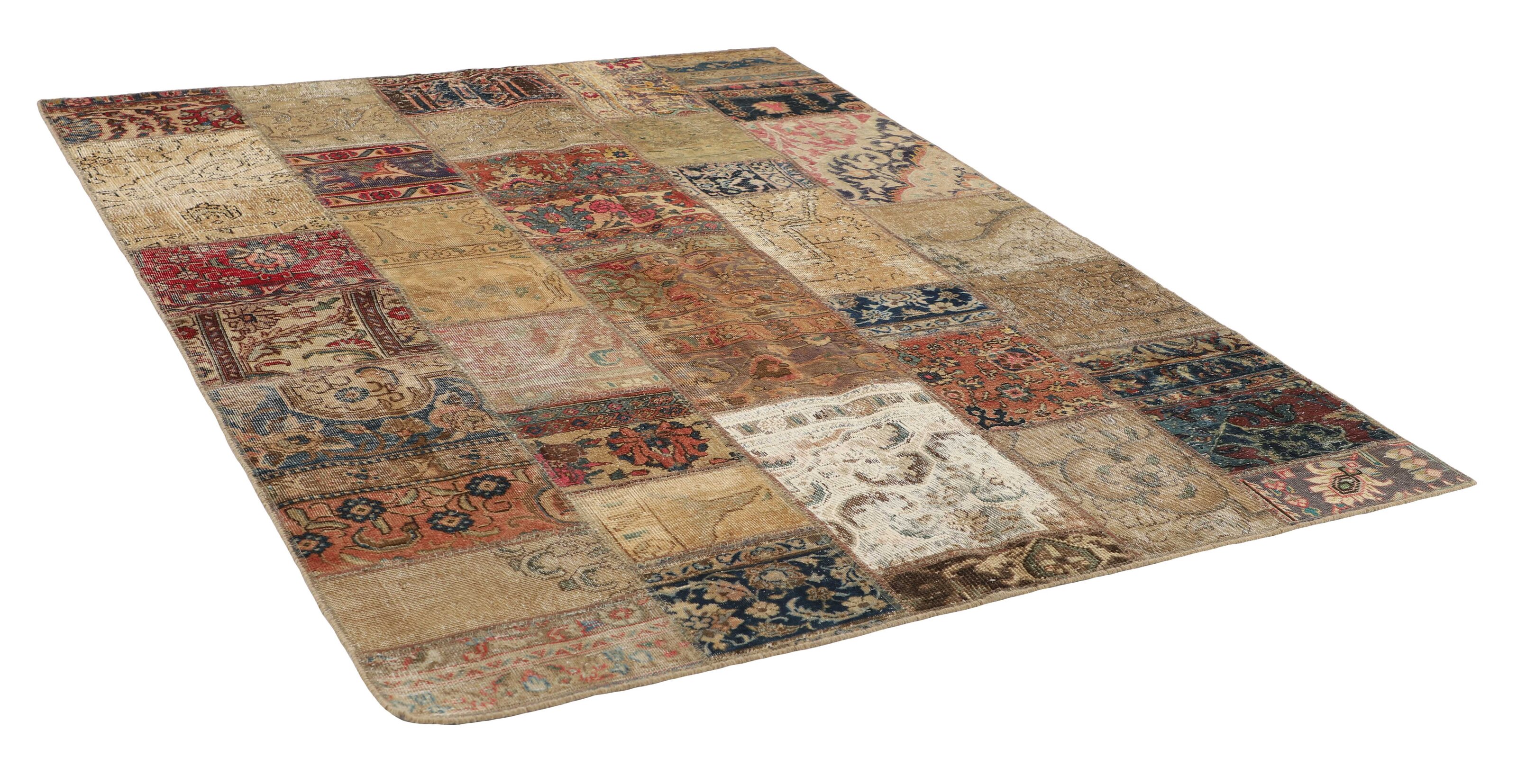 Vintage PatchworkItem no.: 1521965 Size: 175 cm x 248 cmVintage Royals are antique hand knotted rugs of Persian origin. The Patchwork Collection consists of old rugs that have been beyond repair, and instead cut into smaller pieces and used for patchwork. The Patchwork pieces are stonewashed and recoloured in light, dark, or bright colours, with the old pattern just being visible. The Patchwork rug forms a whole new and unique design. The rugs are of a very high quality and are available in large sizes. With the Vintage Royal Patchwork Collection, you do not just get a rug; you adorn your home with a unique piece of antique, Persian handcraft.