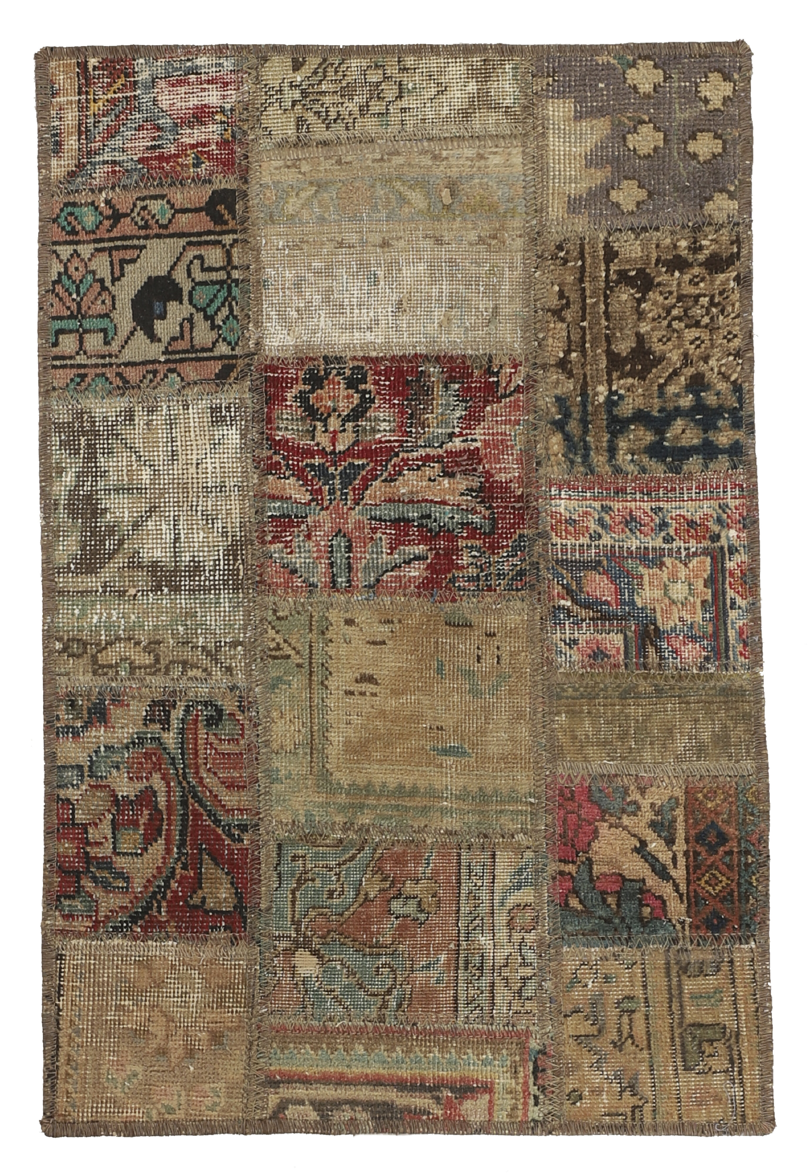 Vintage PatchworkItem no.: 1522116 Size: 61 cm x 92 cmVintage Royals are antique hand knotted rugs of Persian origin. The Patchwork Collection consists of old rugs that have been beyond repair, and instead cut into smaller pieces and used for patchwork. The Patchwork pieces are stonewashed and recoloured in light, dark, or bright colours, with the old pattern just being visible. The Patchwork rug forms a whole new and unique design. The rugs are of a very high quality and are available in large sizes. With the Vintage Royal Patchwork Collection, you do not just get a rug; you adorn your home with a unique piece of antique, Persian handcraft.