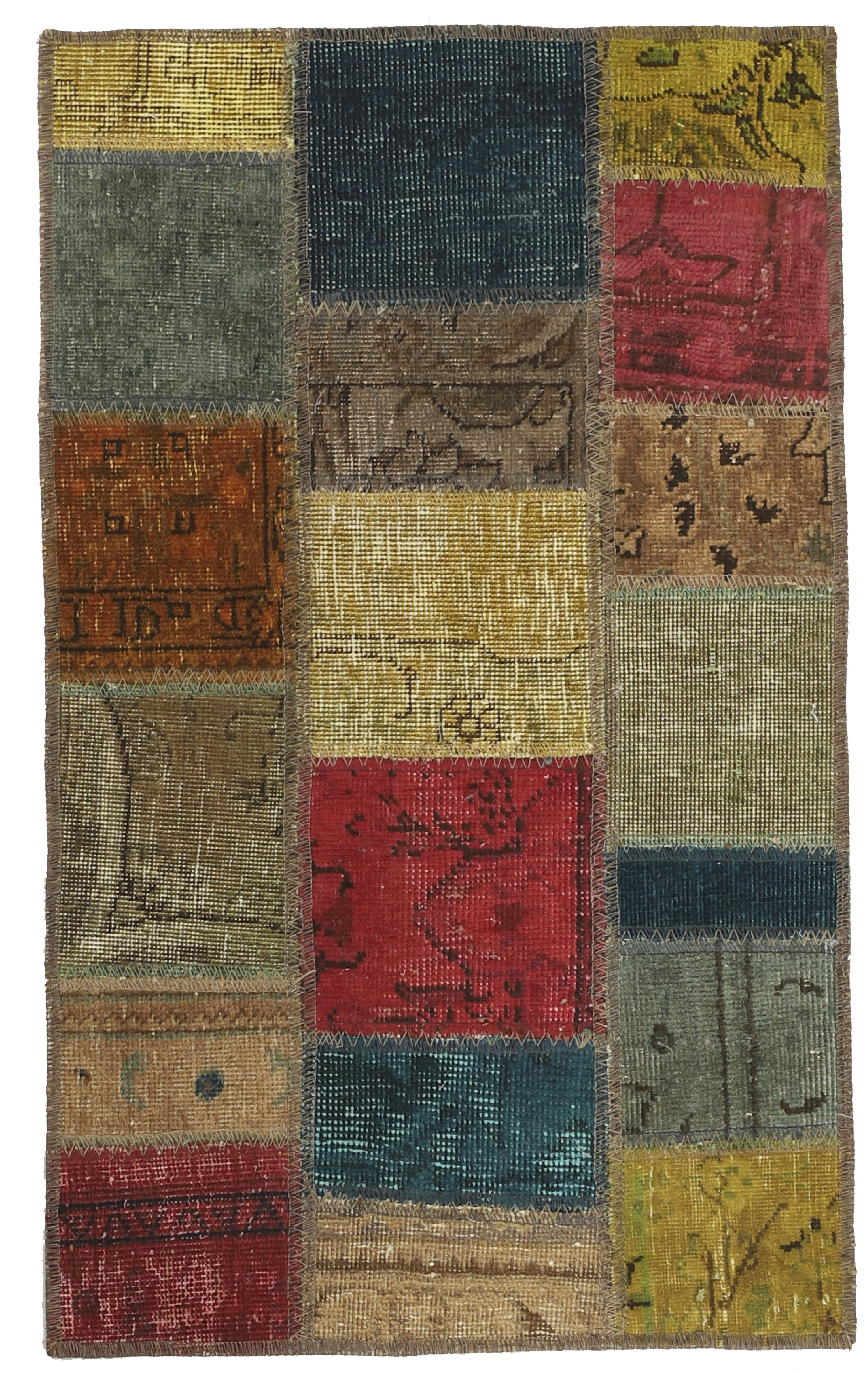 Vintage PatchworkItem no.: 1522141 Size: 61 cm x 100 cmVintage Royals are antique hand knotted rugs of Persian origin. The Patchwork Collection consists of old rugs that have been beyond repair, and instead cut into smaller pieces and used for patchwork. The Patchwork pieces are stonewashed and recoloured in light, dark, or bright colours, with the old pattern just being visible. The Patchwork rug forms a whole new and unique design. The rugs are of a very high quality and are available in large sizes. With the Vintage Royal Patchwork Collection, you do not just get a rug; you adorn your home with a unique piece of antique, Persian handcraft.