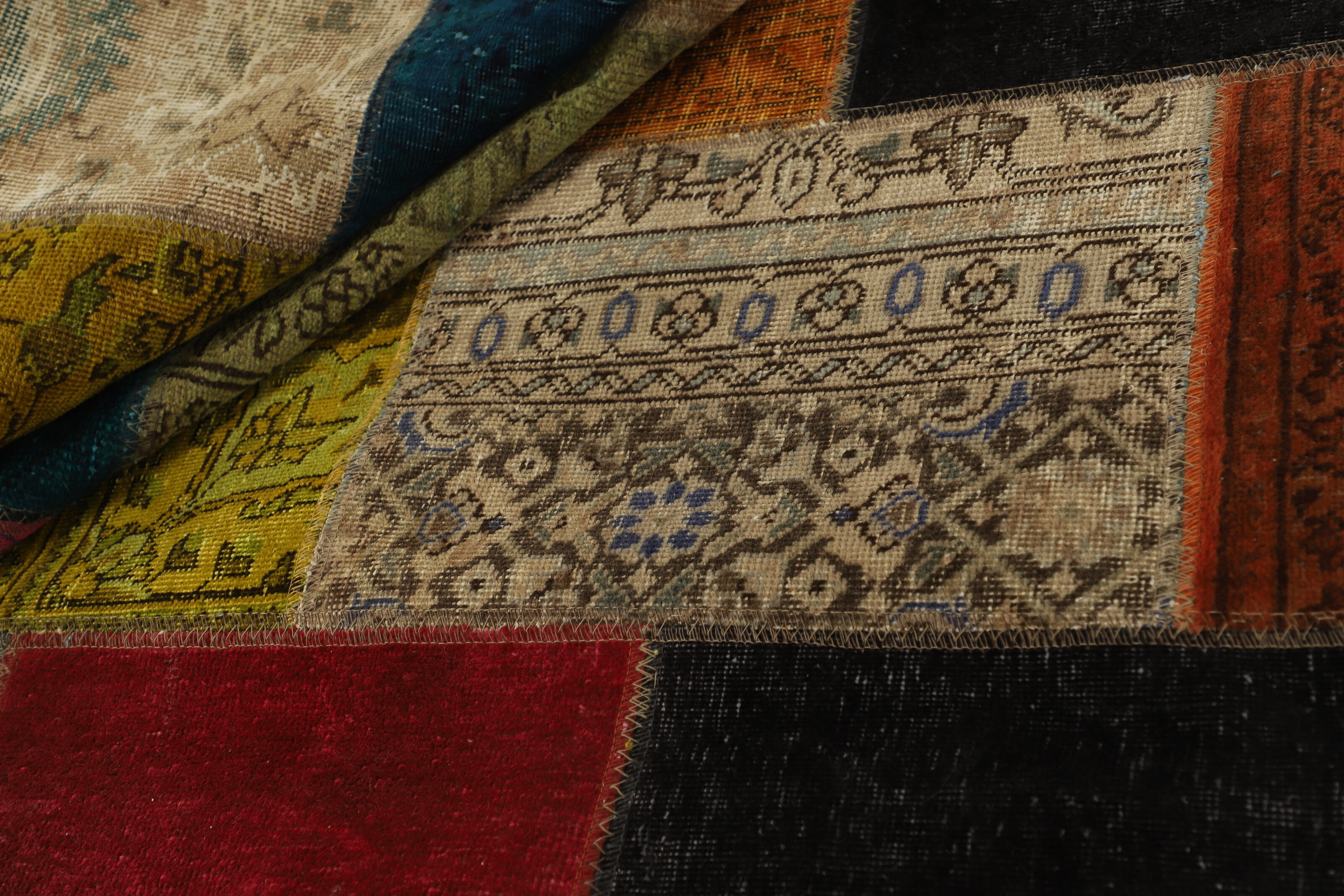 Vintage PatchworkItem no.: 1522156 Size: 252 cm x 356 cmVintage Royals are antique hand knotted rugs of Persian origin. The Patchwork Collection consists of old rugs that have been beyond repair, and instead cut into smaller pieces and used for patchwork. The Patchwork pieces are stonewashed and recoloured in light, dark, or bright colours, with the old pattern just being visible. The Patchwork rug forms a whole new and unique design. The rugs are of a very high quality and are available in large sizes. With the Vintage Royal Patchwork Collection, you do not just get a rug; you adorn your home with a unique piece of antique, Persian handcraft.