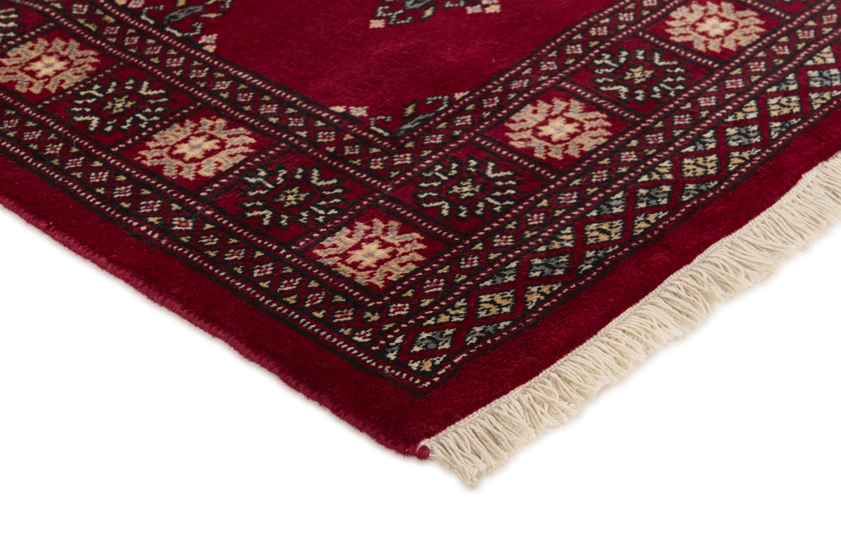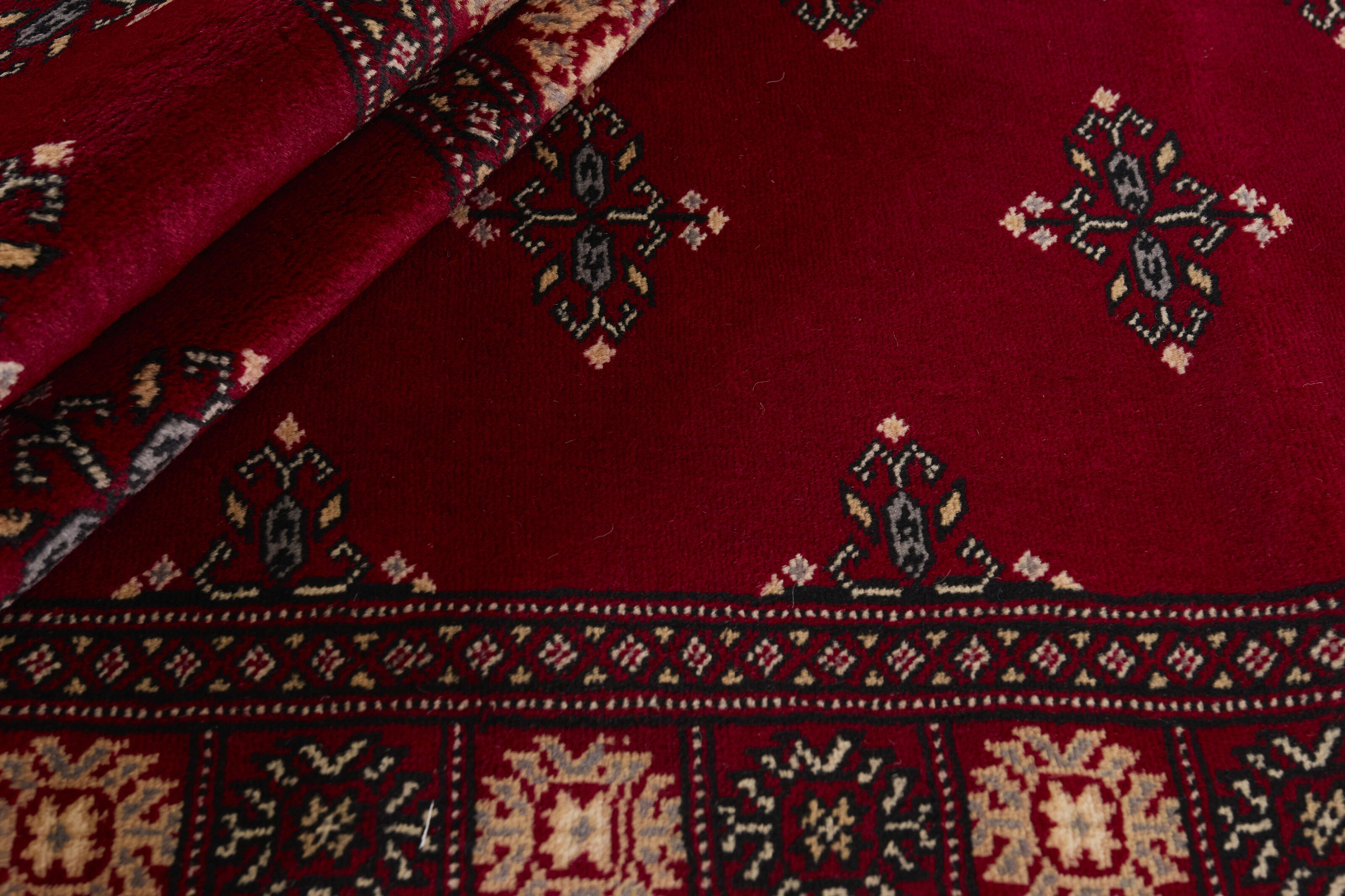 The 2-Ply rugs are produced in Lahore, Pakistan’s second largest city, which is also is the centre of the country’s hand knotted rug production. The rugs most often have the Tekke and Bokara patterns, which were originally inspired by patterns from Turkmenistan. The people of the Tekke Tribe, which was the largest nomadic tribe in Turkmenistan, were known as very industrious rug producers. The term Ply indicates the number of threads wound together to produce the yarn itself; 2-Ply thus guarantees that two threads were wound together during the knotting to make the yarn. The quality of wool is particularly soft and shining, and the warm-coloured patterns are simple and harmonious.