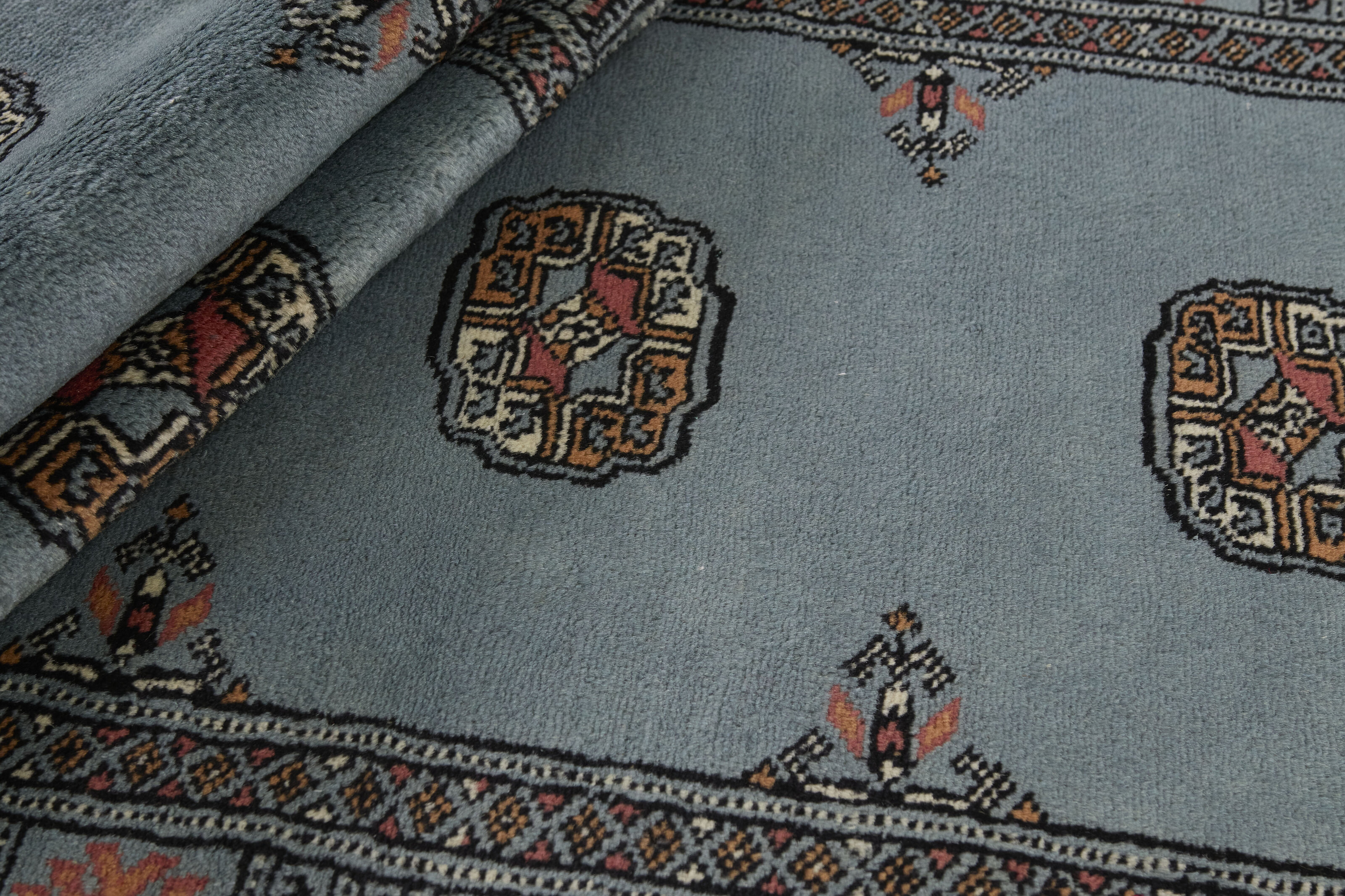 The 2-Ply rugs are produced in Lahore, Pakistan’s second largest city, which is also is the centre of the country’s hand knotted rug production. The rugs most often have the Tekke and Bokara patterns, which were originally inspired by patterns from Turkmenistan. The people of the Tekke Tribe, which was the largest nomadic tribe in Turkmenistan, were known as very industrious rug producers. The term Ply indicates the number of threads wound together to produce the yarn itself; 2-Ply thus guarantees that two threads were wound together during the knotting to make the yarn. The quality of wool is particularly soft and shining, and the warm-coloured patterns are simple and harmonious.