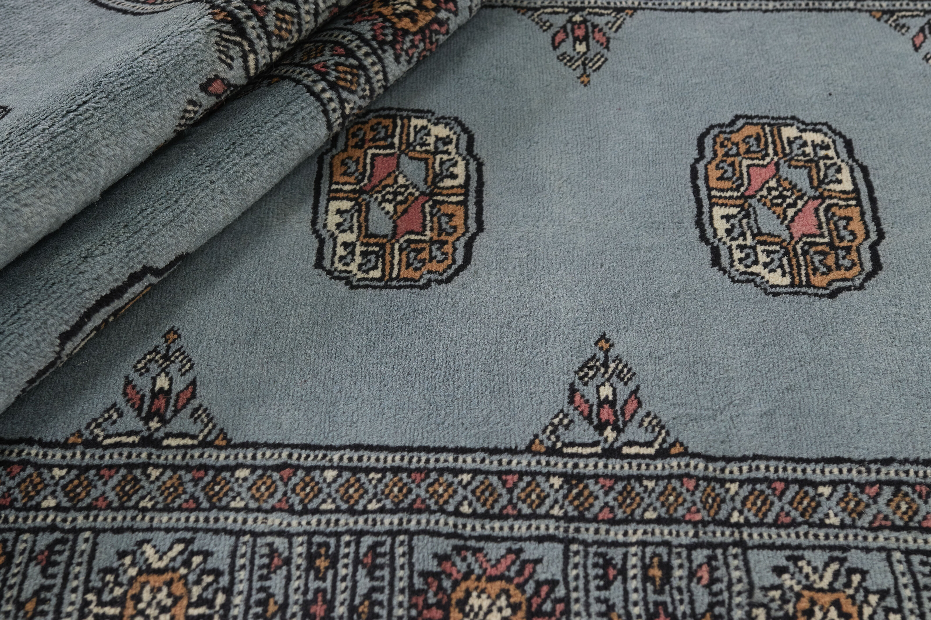 The 2-Ply rugs are produced in Lahore, Pakistan’s second largest city, which is also is the centre of the country’s hand knotted rug production. The rugs most often have the Tekke and Bokara patterns, which were originally inspired by patterns from Turkmenistan. The people of the Tekke Tribe, which was the largest nomadic tribe in Turkmenistan, were known as very industrious rug producers. The term Ply indicates the number of threads wound together to produce the yarn itself; 2-Ply thus guarantees that two threads were wound together during the knotting to make the yarn. The quality of wool is particularly soft and shining, and the warm-coloured patterns are simple and harmonious.