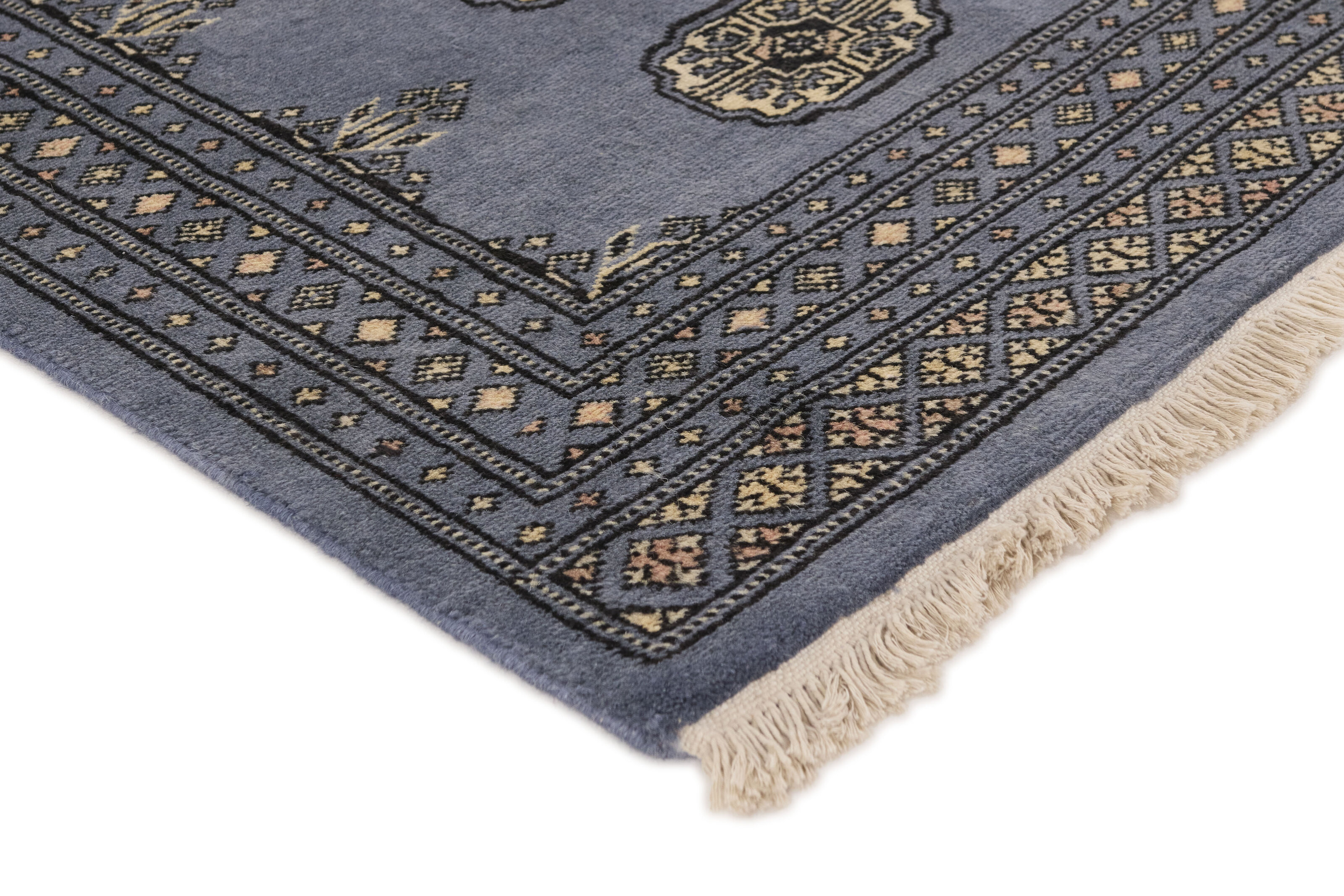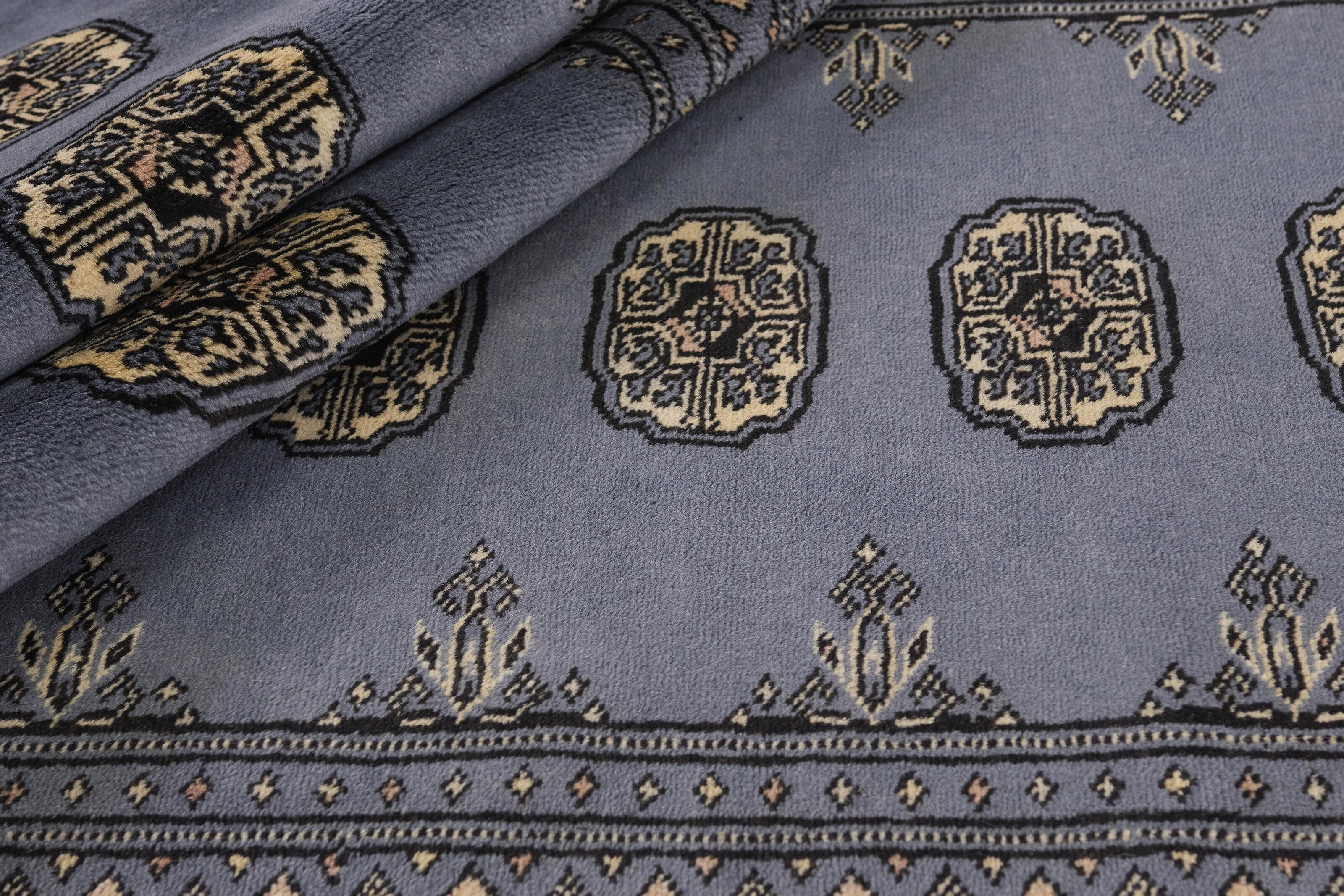 The 2-Ply rugs are produced in Lahore, Pakistan’s second largest city, which is also is the centre of the country’s hand knotted rug production. The rugs most often have the Tekke and Bokara patterns, which were originally inspired by patterns from Turkmenistan. The people of the Tekke Tribe, which was the largest nomadic tribe in Turkmenistan, were known as very industrious rug producers. The term Ply indicates the number of threads wound together to produce the yarn itself; 2-Ply thus guarantees that two threads were wound together during the knotting to make the yarn. The quality of wool is particularly soft and shining, and the warm-coloured patterns are simple and harmonious.