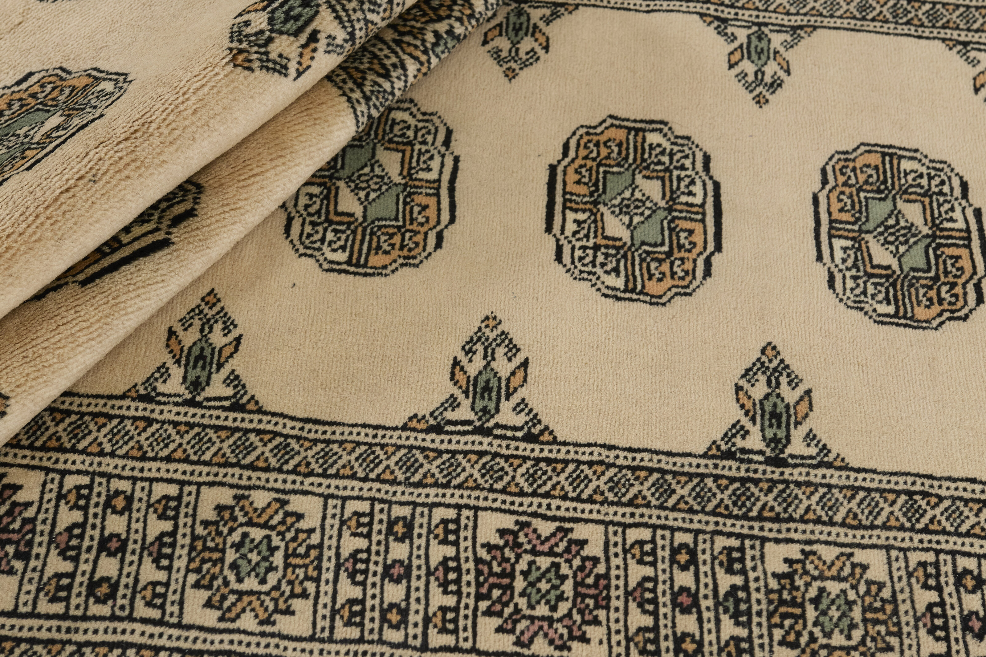 The 2-Ply rugs are produced in Lahore, Pakistan’s second largest city, which is also is the centre of the country’s hand knotted rug production. The rugs most often have the Tekke and Bokara patterns, which were originally inspired by patterns from Turkmenistan. The people of the Tekke Tribe, which was the largest nomadic tribe in Turkmenistan, were known as very industrious rug producers. The term Ply indicates the number of threads wound together to produce the yarn itself; 2-Ply thus guarantees that two threads were wound together during the knotting to make the yarn. The quality of wool is particularly soft and shining, and the warm-coloured patterns are simple and harmonious.